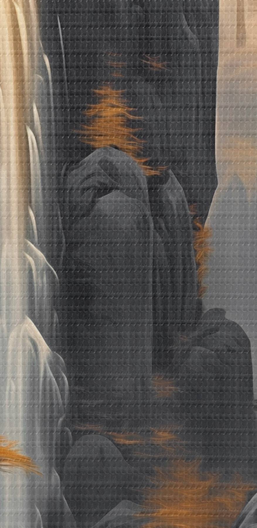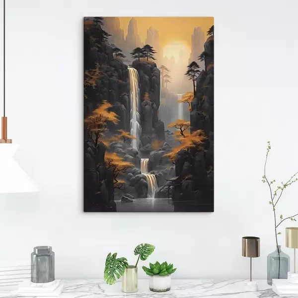 Schilderij Rotsachtig landschap met een waterval in warme zonsondergangtinten Art. s46177