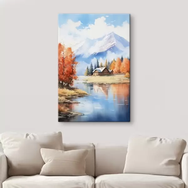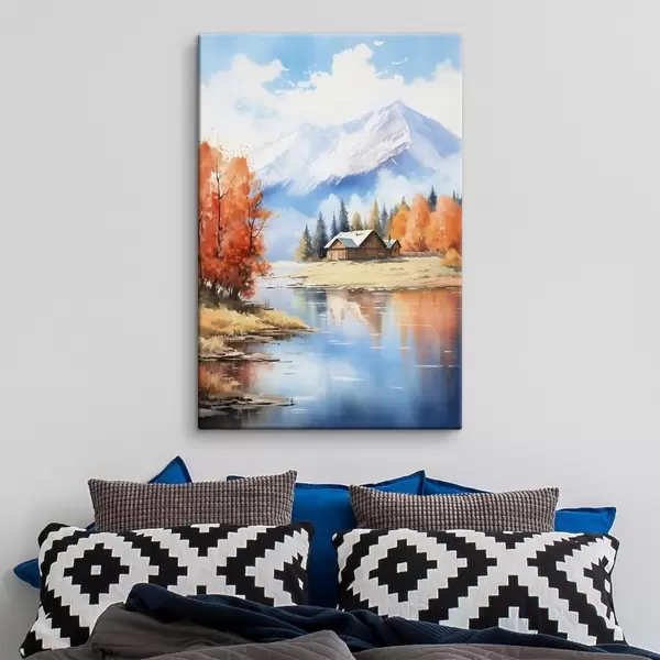 Schilderijen Herfstlandschap aan het meer met een huis en bergen s46184