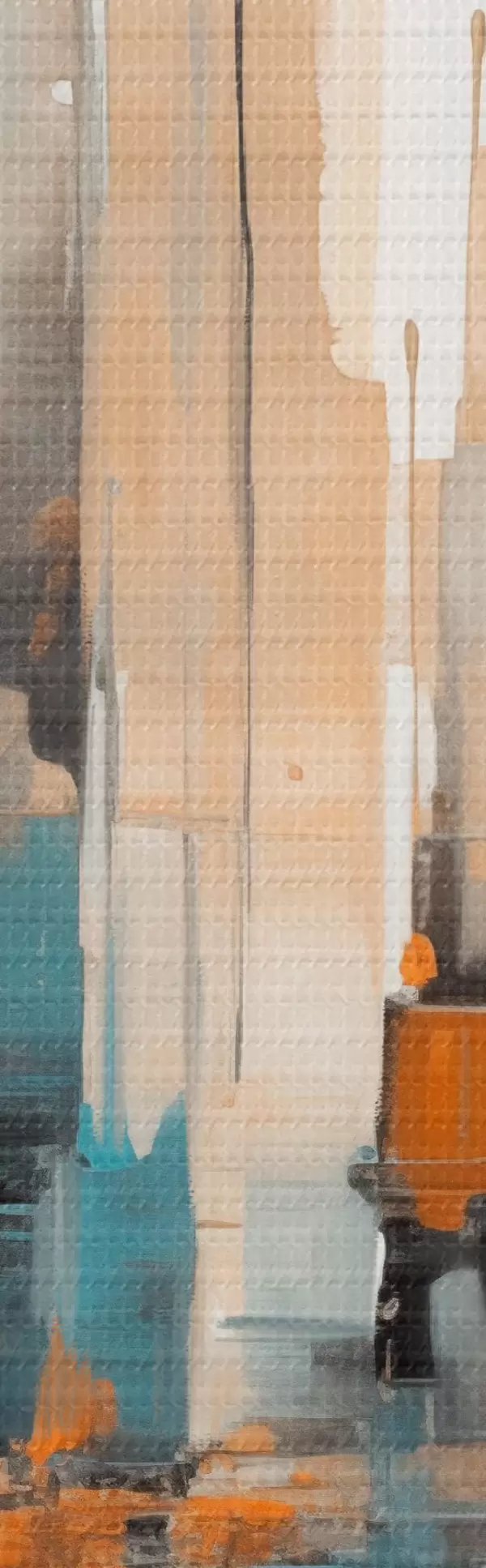 Schilderij Abstract stadsgezicht met oranje, blauwgroene en bruine verticale penseelstreken en geometrische vormen Art. s46266
