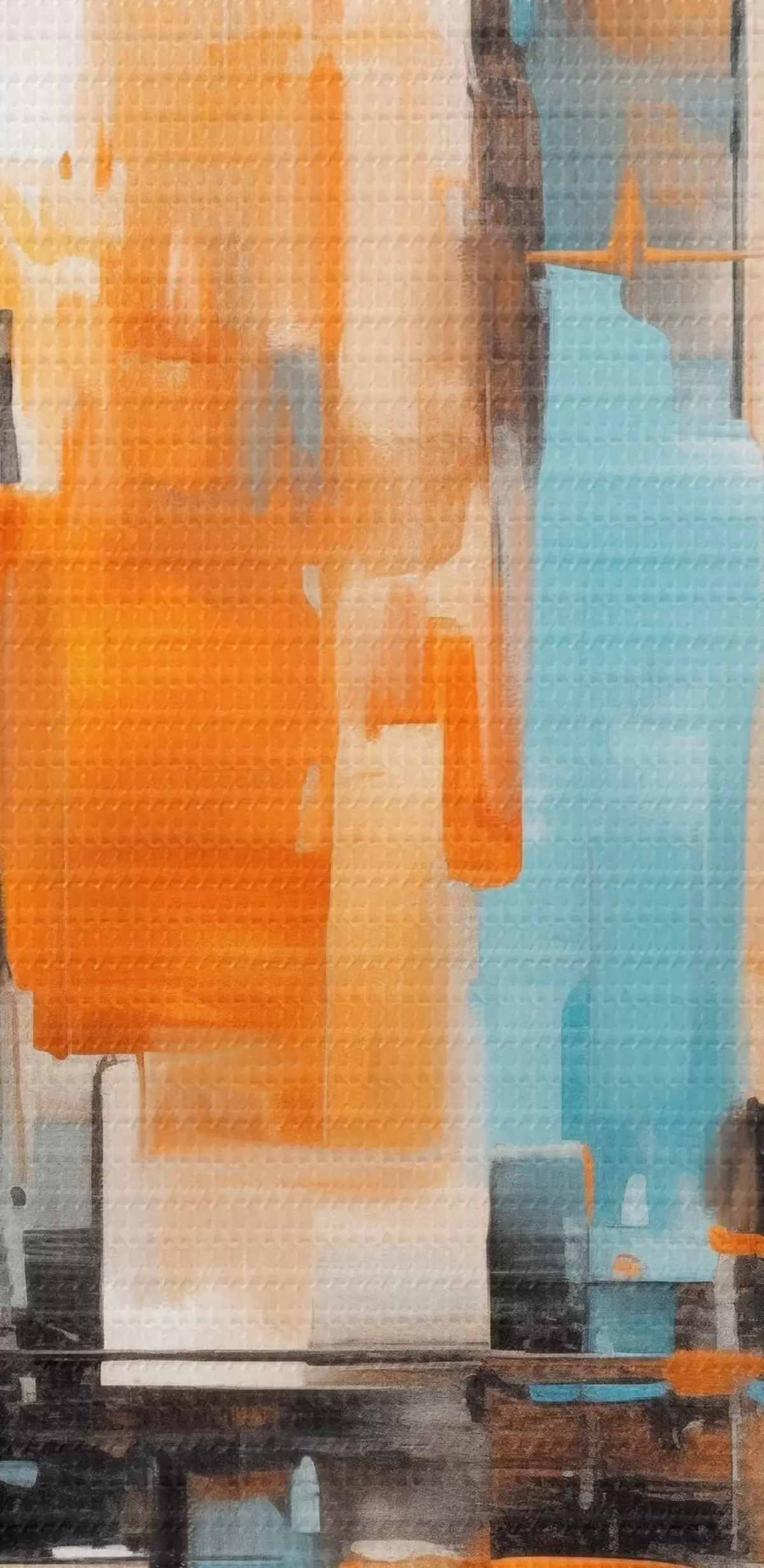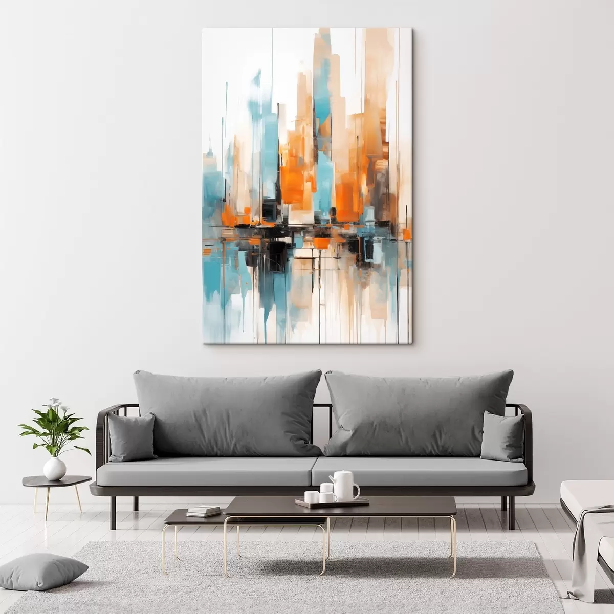 Schilderij Abstract stadsgezicht met verticale penseelstreken in tinten oranje, blauw en wit, schilderstijl Art. s46267