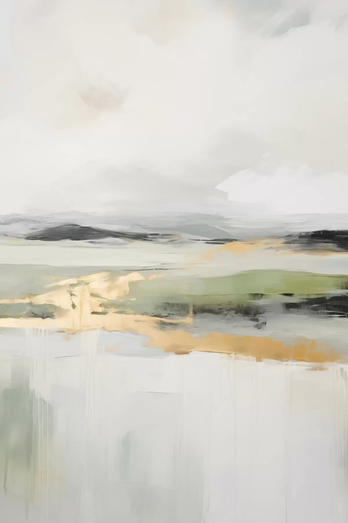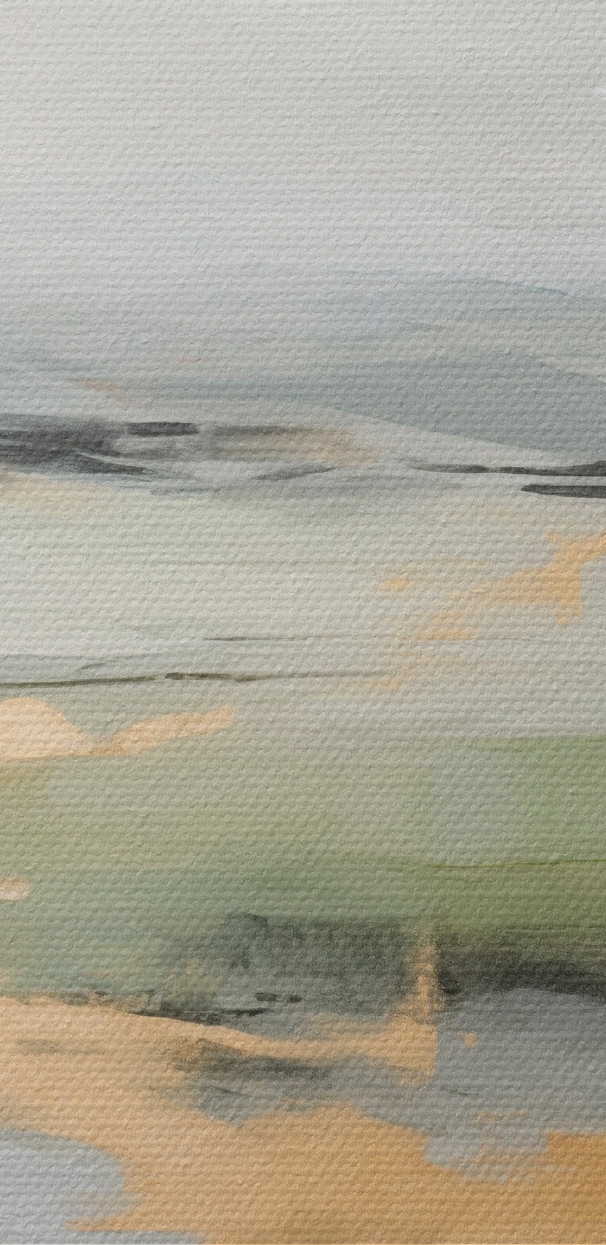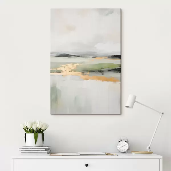 Schilderij Abstract landschap met gele accenten, een minimalistische compositie van land, water en lucht, met gedempte kleuren Art. s46269