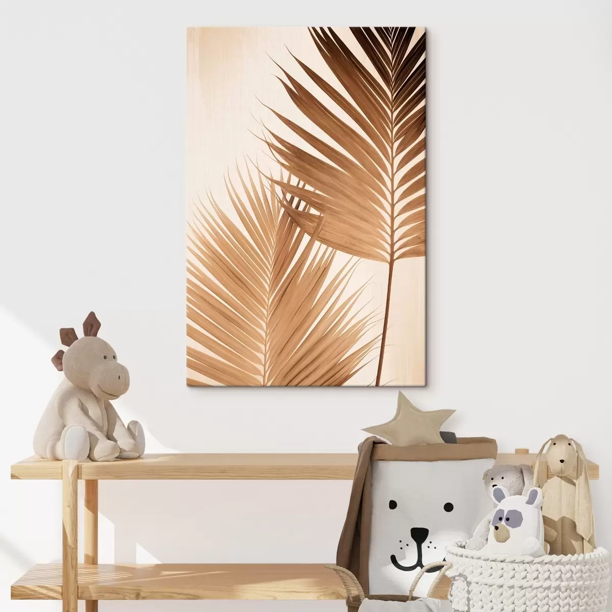 Schilderij Palmbladeren in bruine tinten, neutrale achtergrond, minimalistische stijl, natuurlijke belichting, tropische sfeer Art. s46274