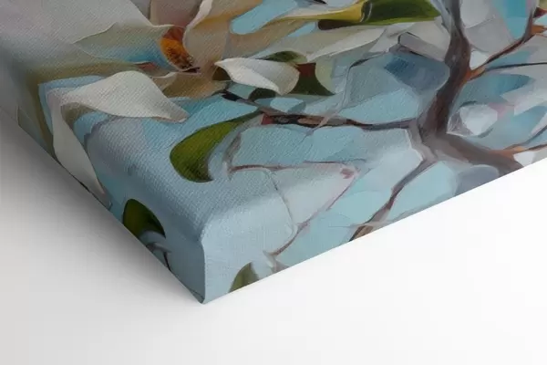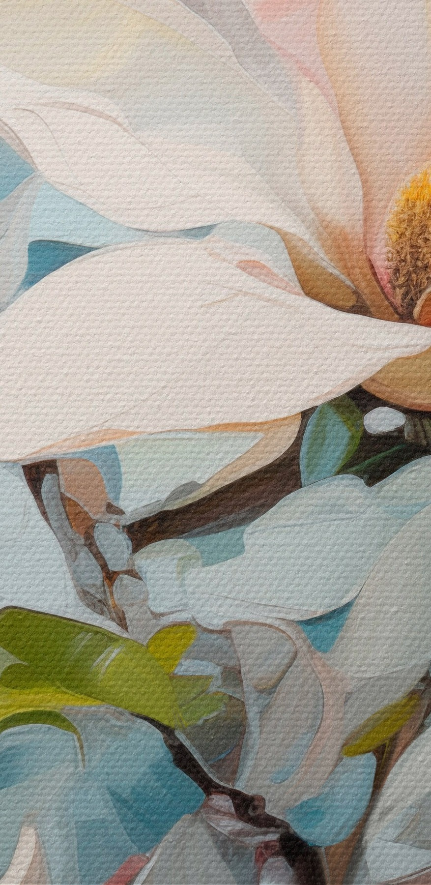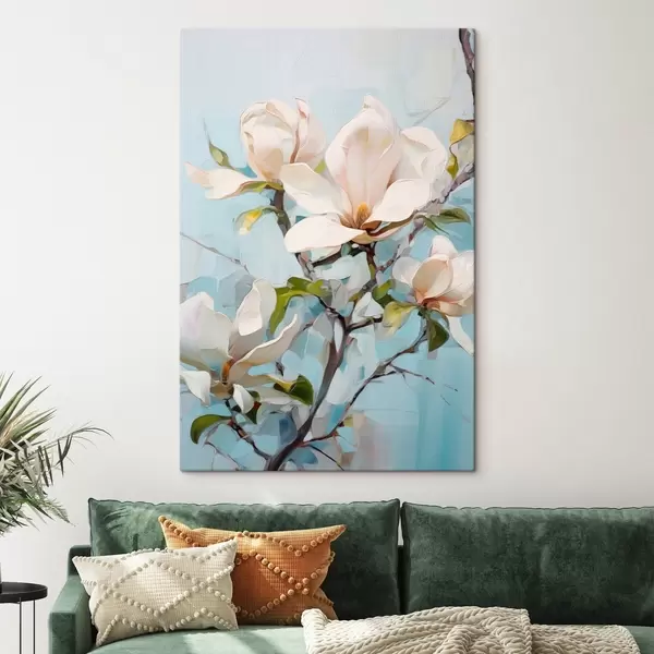 Schilderij Witte magnoliabloemen, lichtblauwe achtergrond met zachte penseelstreken, olieverfstijl, impasto-textuur Art. s46277