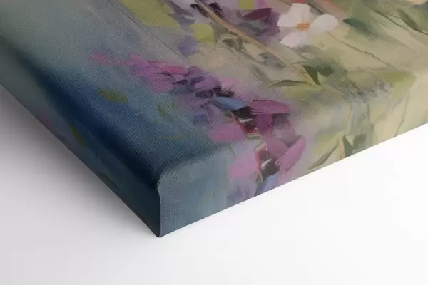 Schilderijen Roze en paarse bloemen met witte madeliefjes in een veld, zachte penseelstreken, pastelkleuren, impressionistische stijl s46279