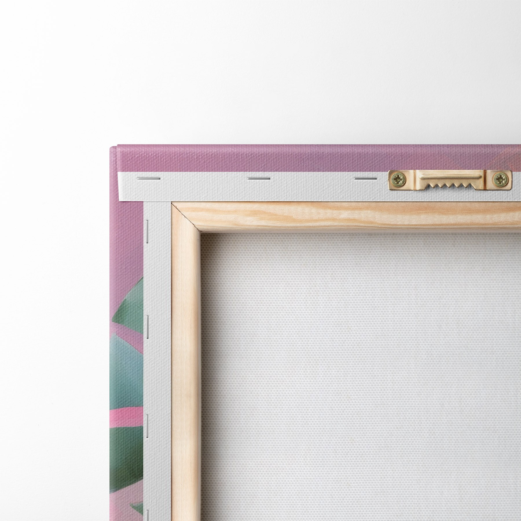 Schilderij Abstracte monstera-plant met levendig groene bladeren, tegen een achtergrond van zachte roze en paarse tinten Art. s46286