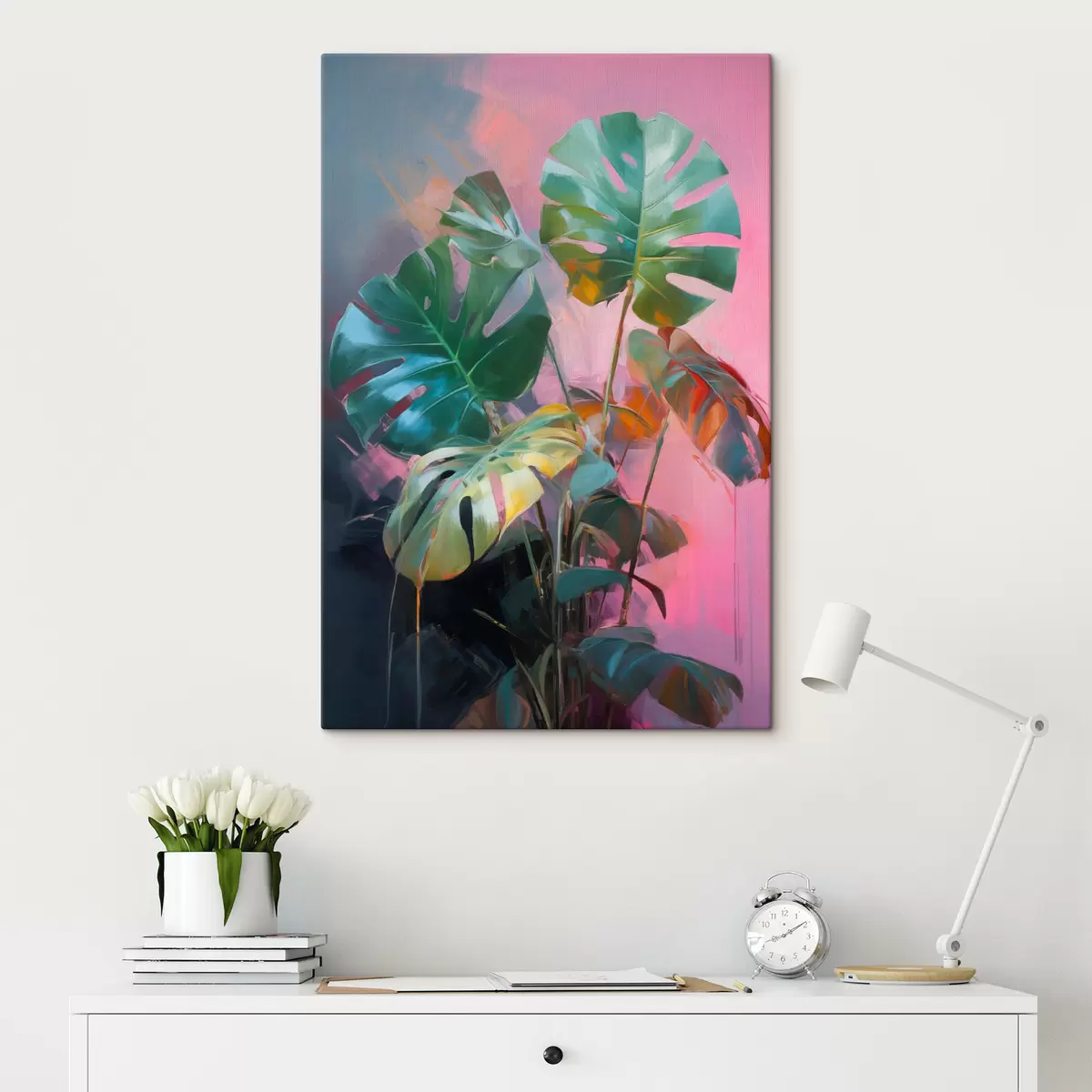 Schilderij Abstracte monstera-plant met levendig groene bladeren, tegen een achtergrond van zachte roze en paarse tinten Art. s46286