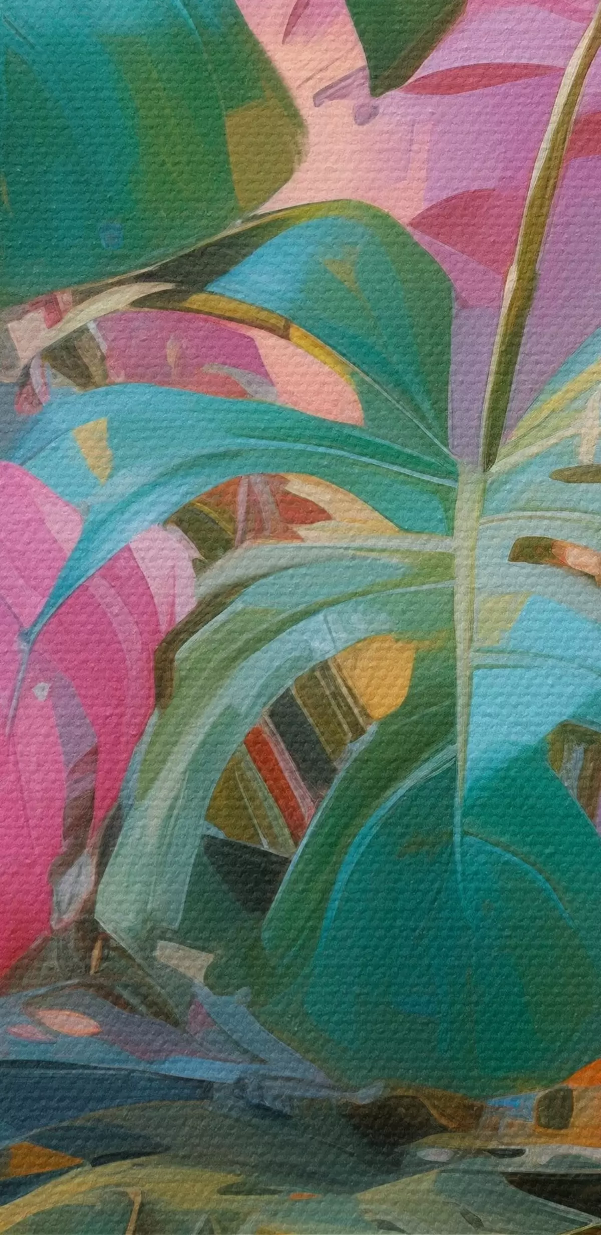 Schilderij Abstracte monstera-plant met roze en groene bladeren, levendige kleuren, tegen een wazige achtergrond Art. s46287
