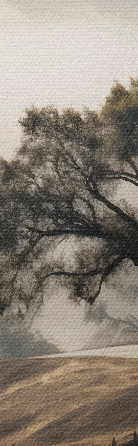 Schilderij Een kronkelende weg door glooiende heuvels met een boom op de voorgrond, de achtergrond met mist en bergen Art. s46288