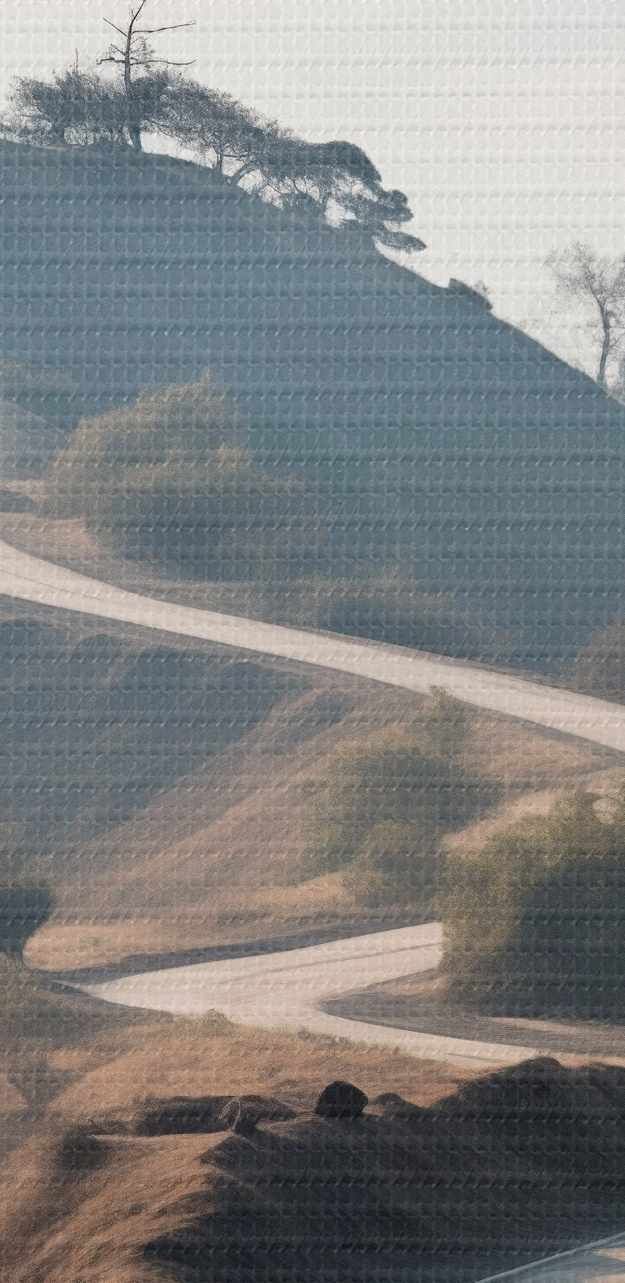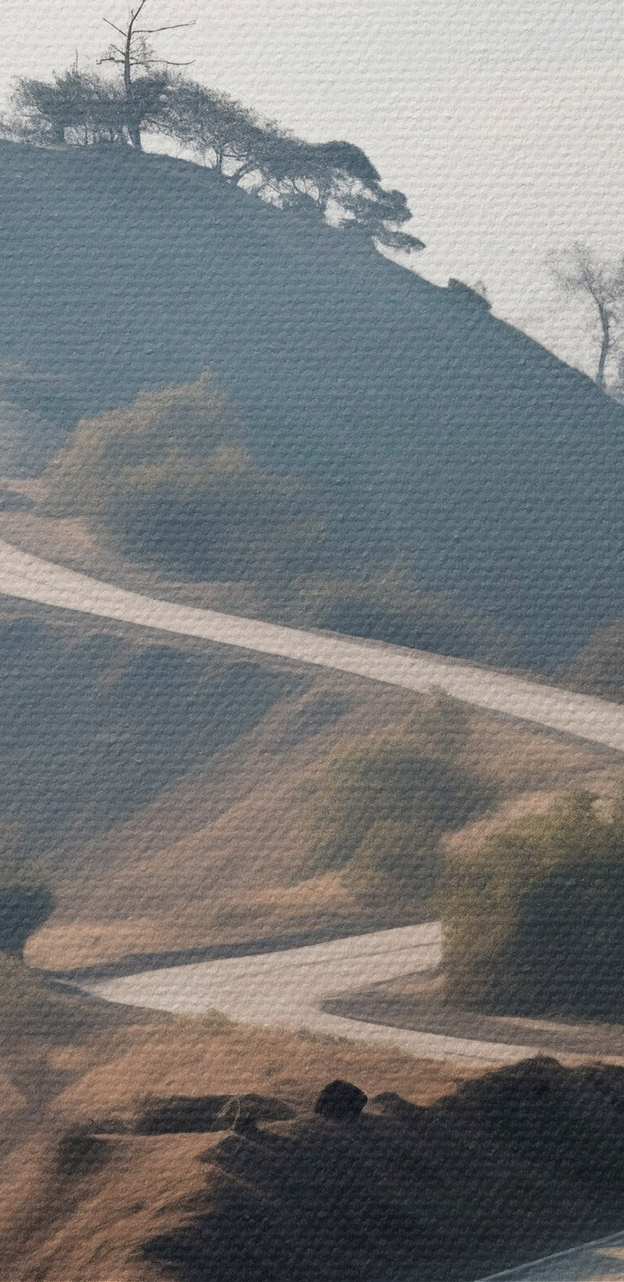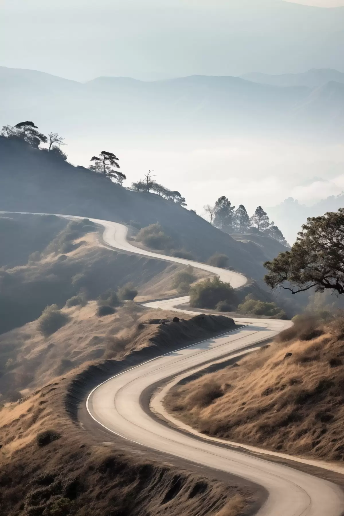 Schilderij Een kronkelende weg door een heuvelachtig landschap met droog gras onder een heldere hemel en bergen in de verte Art. s46289