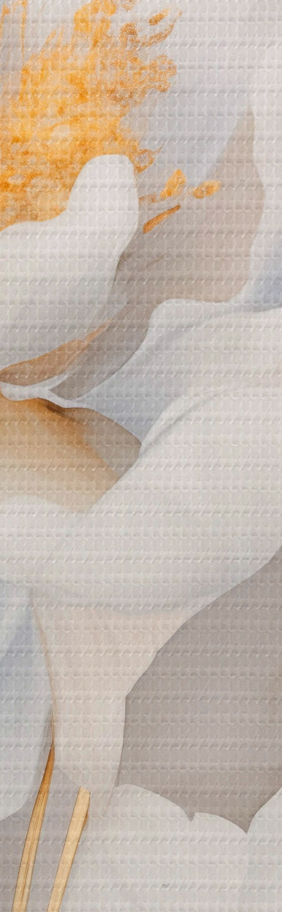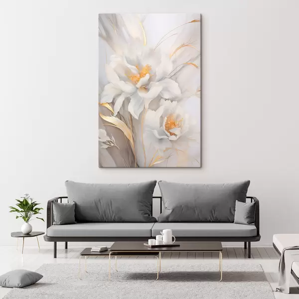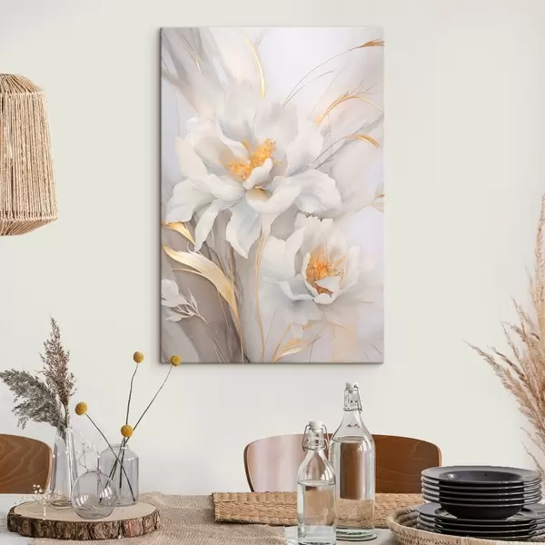 Schilderij Witte bloemen met gele stampers en stelen, delicate bloemblaadjes, elegante compositie, neutrale achtergrond Art. s46293