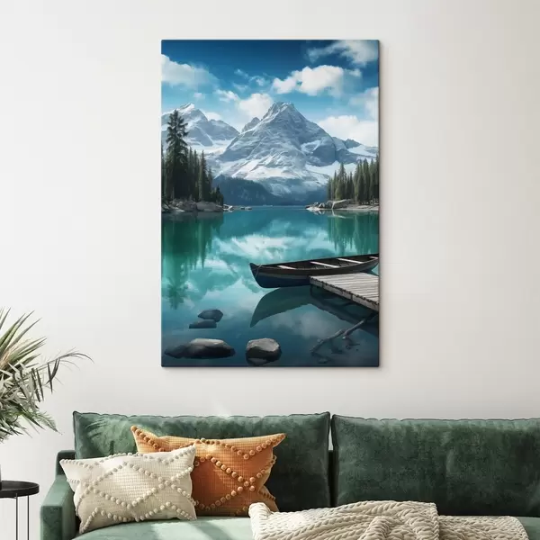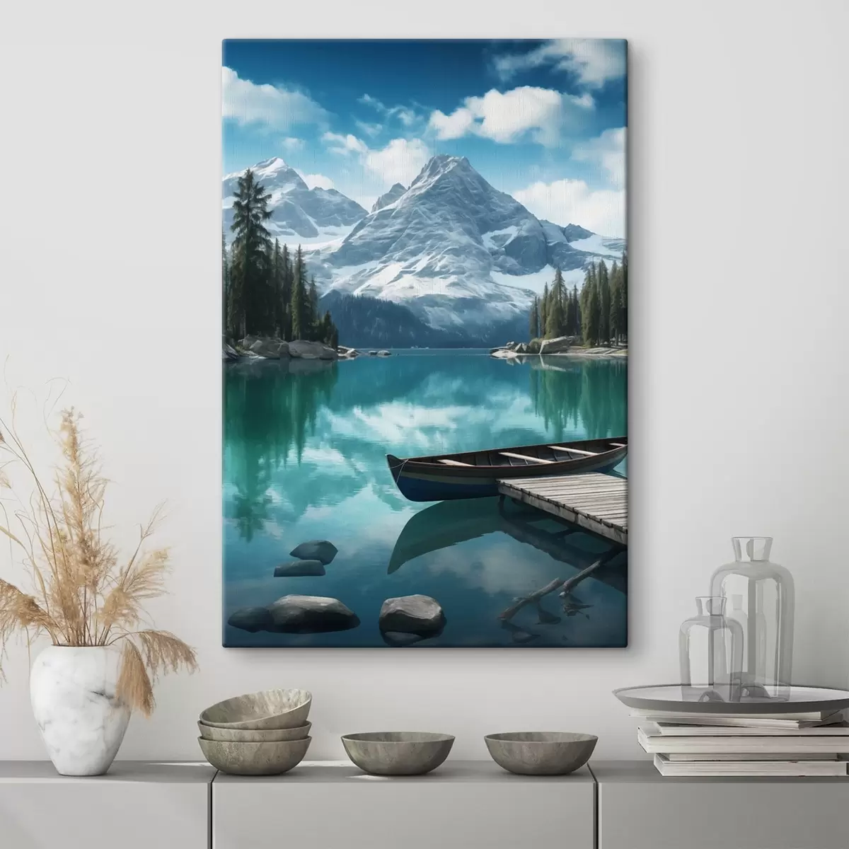 Schilderij Alpien meer met kano en besneeuwde bergtoppen Art. s46481