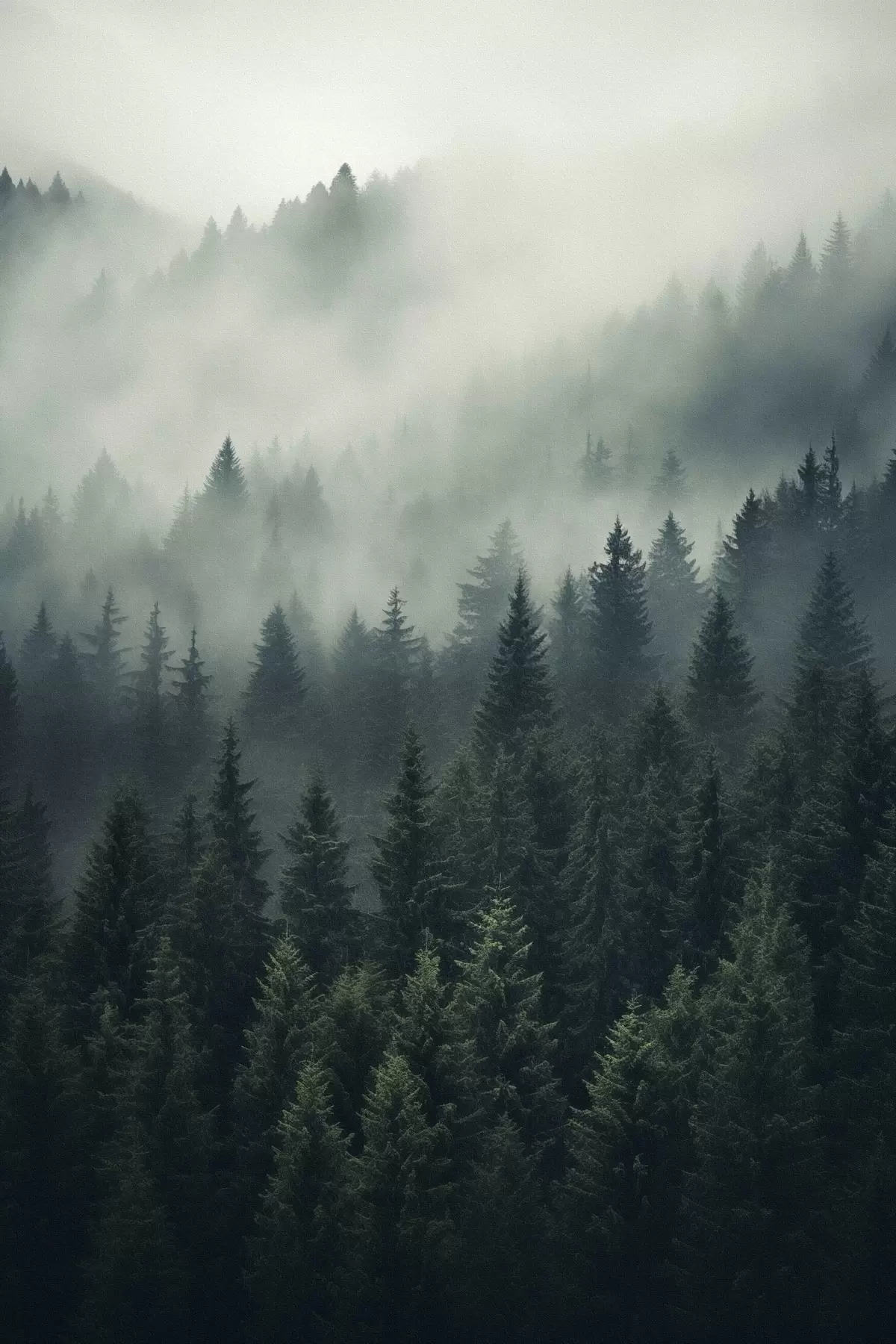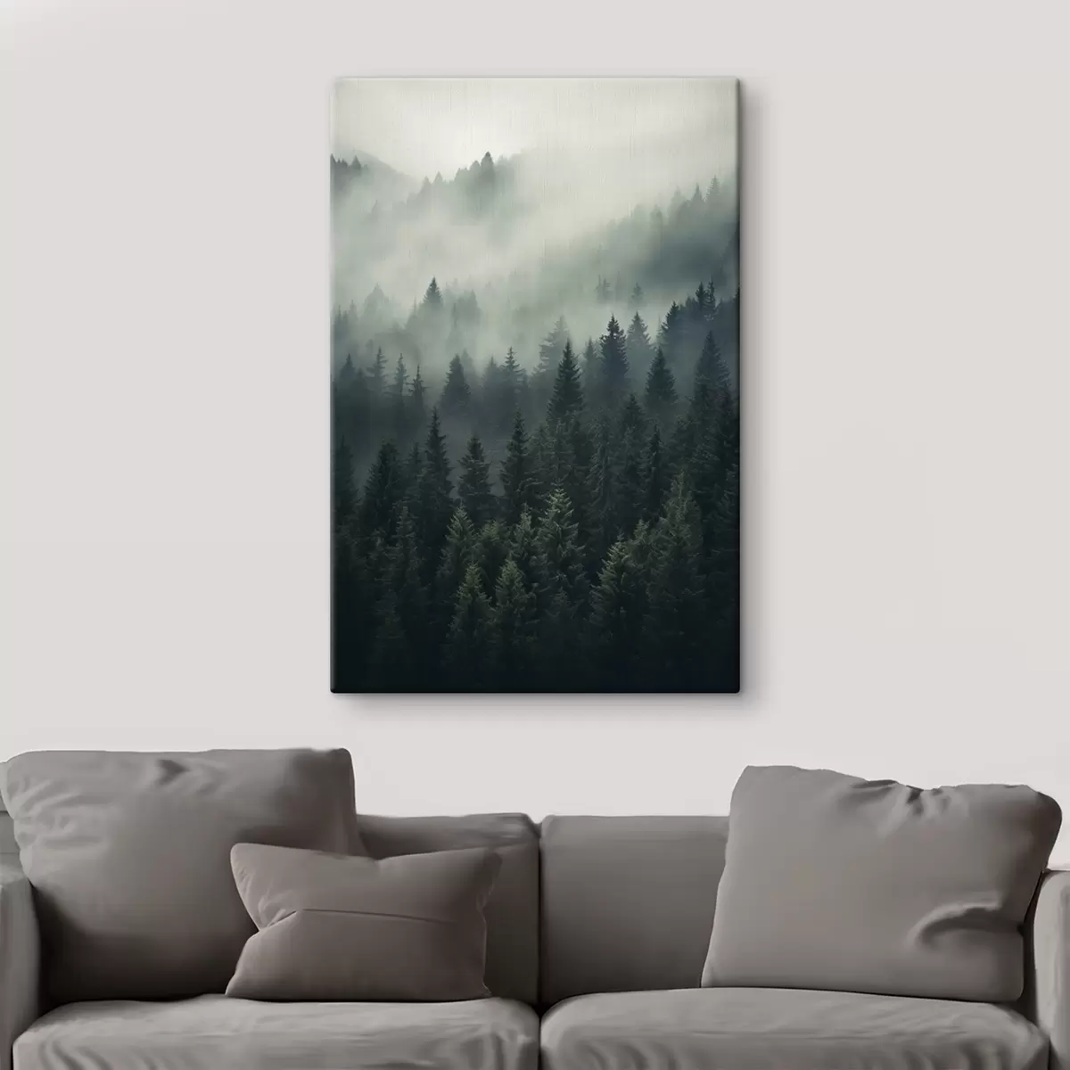 Schilderij Mist die over een dichtbegroeid groenblijvend bos trekt Art. s46512