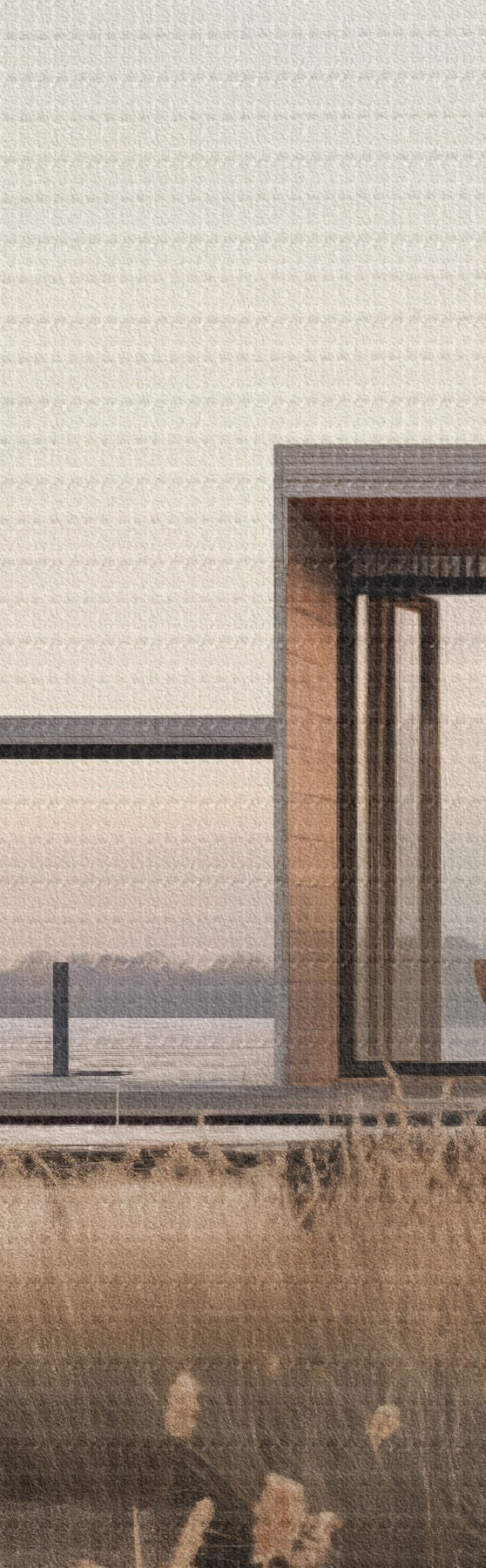 Schilderij Moderne hut aan het meer tussen het riet in de zachte schemering Art. s46513