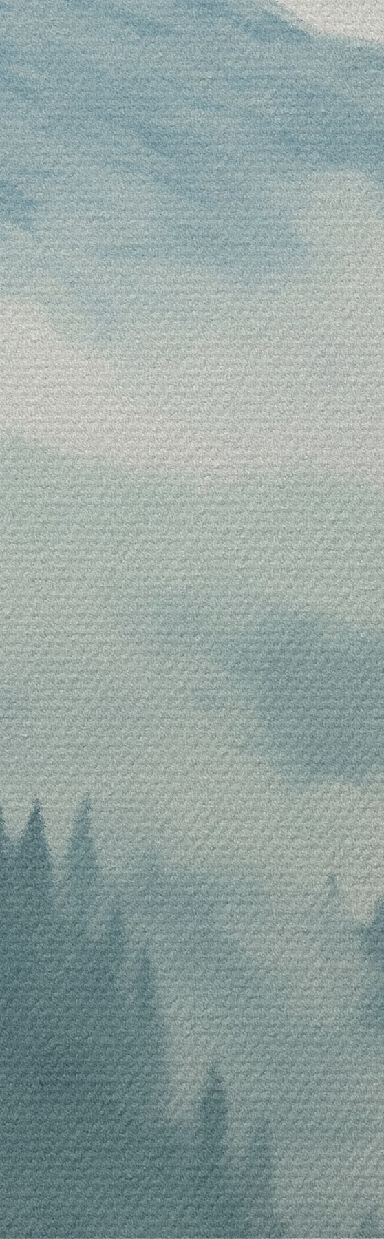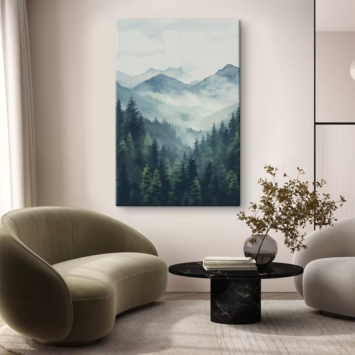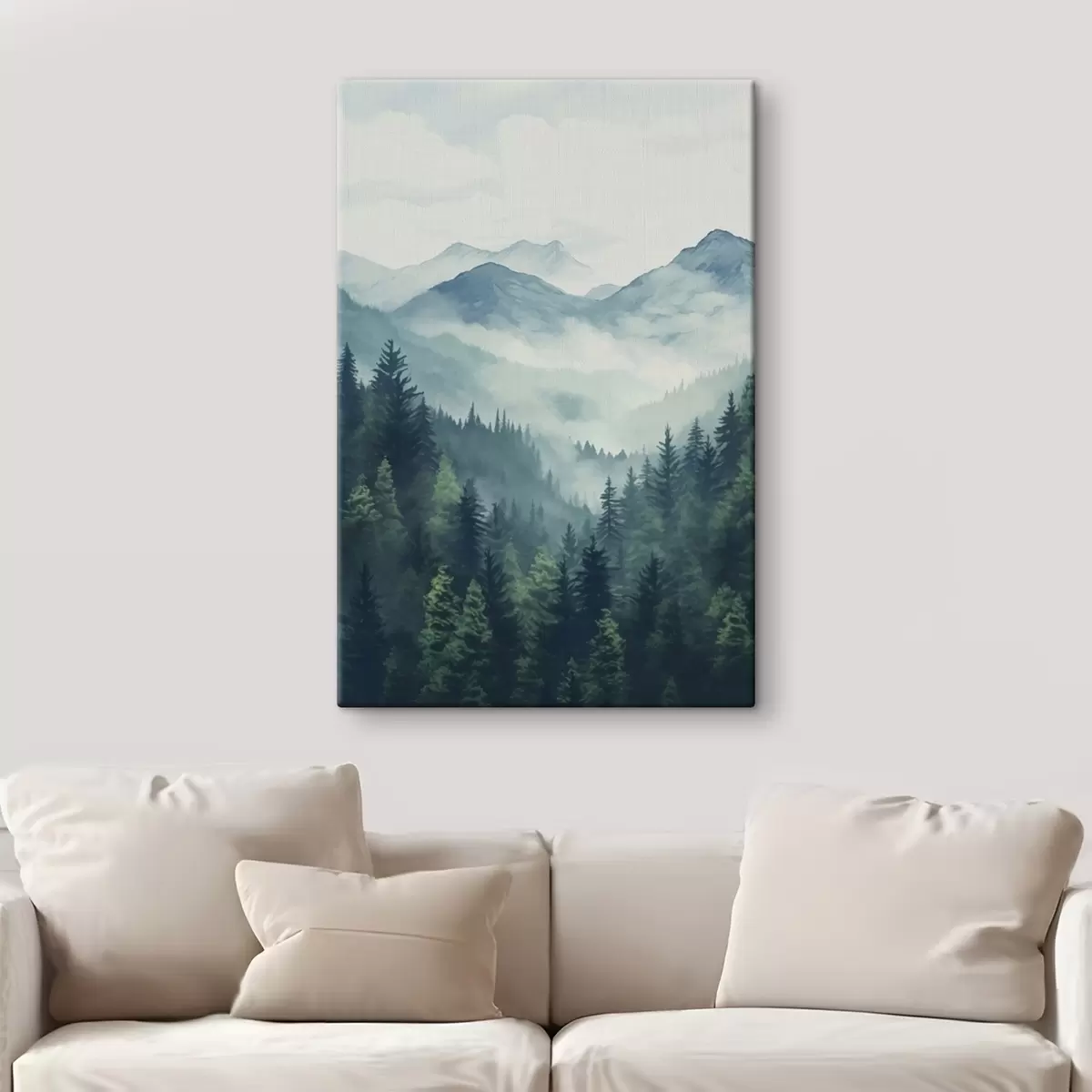 Schilderij Aquarel van bergen en bos in zachte ochtendmist Art. s46519