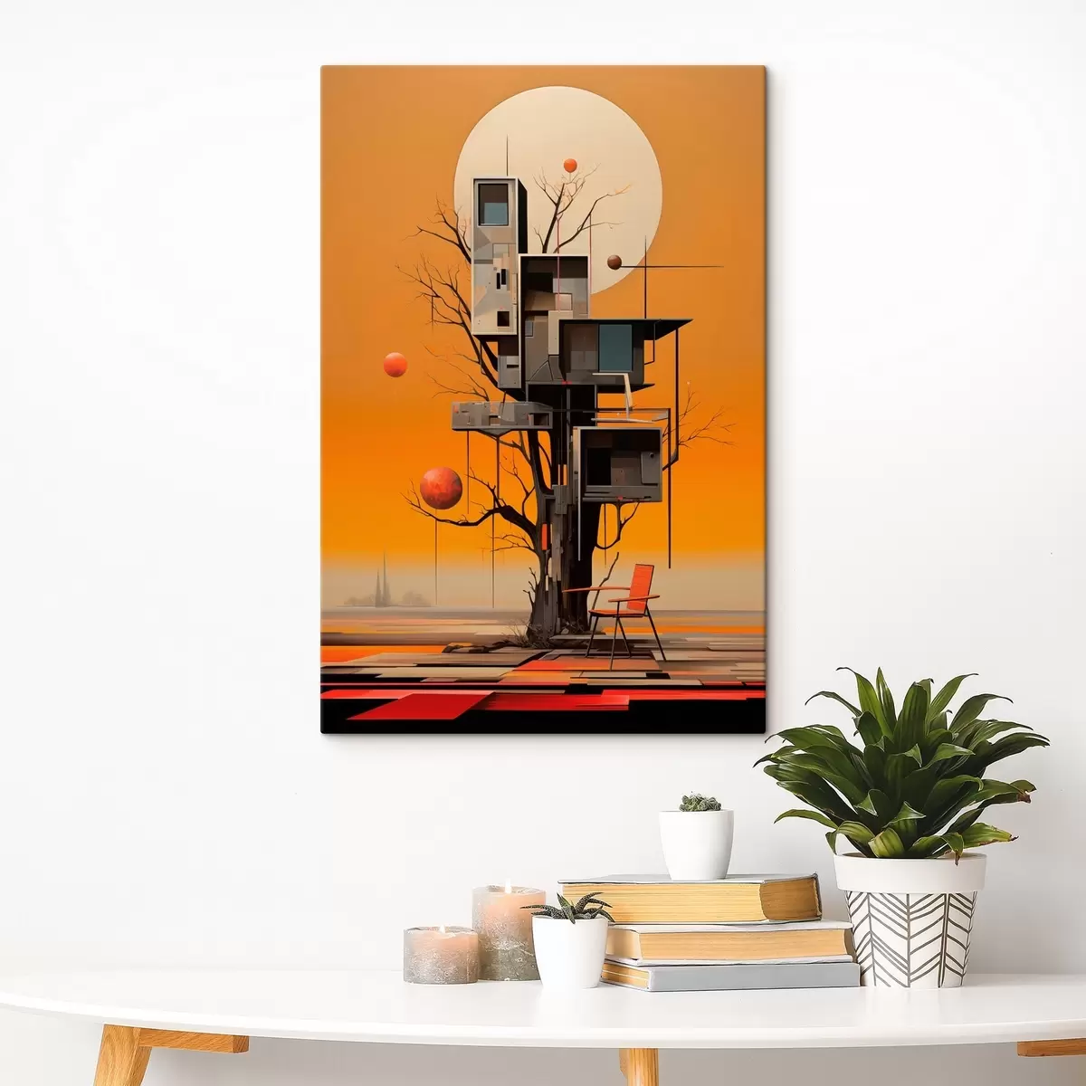 Schilderij Surrealistische boomhut tegen een oranje achtergrond Art. s46526