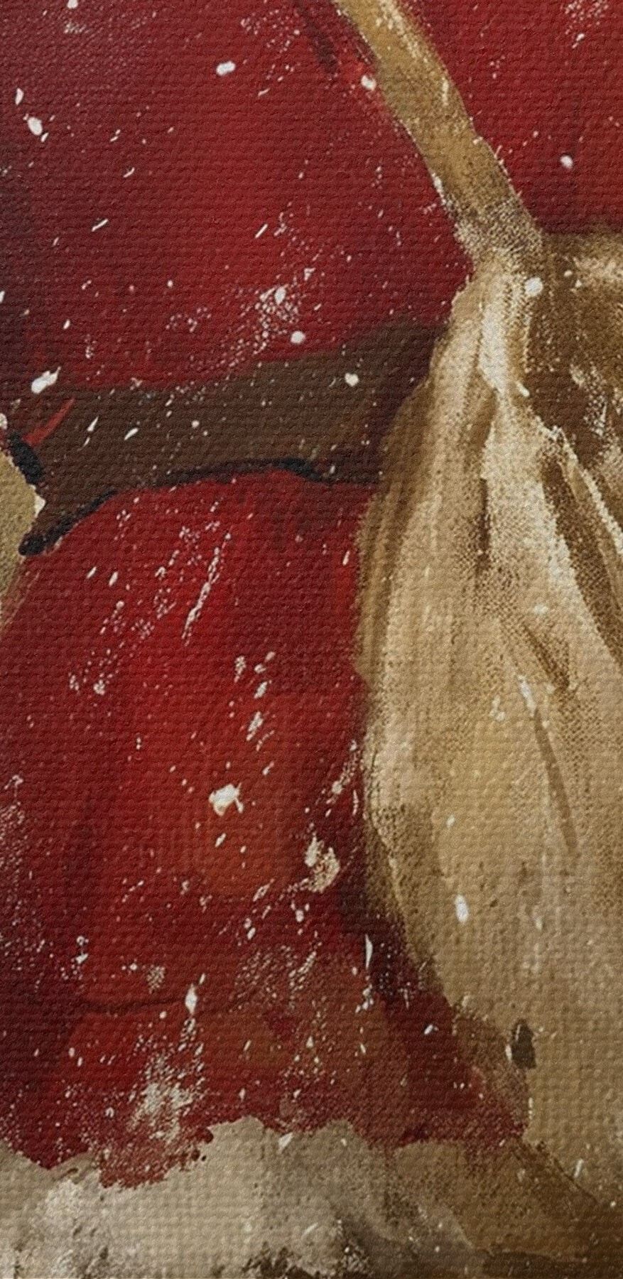 Het schilderij kan voorzichtig worden schoongeveegd met een droge zachte doek of spons; het wordt niet aanbevolen om natte producten te gebruiken. Het gebruik van een vochtige spons is alleen toegestaan als het schilderij gevernist is.