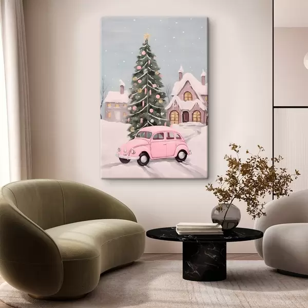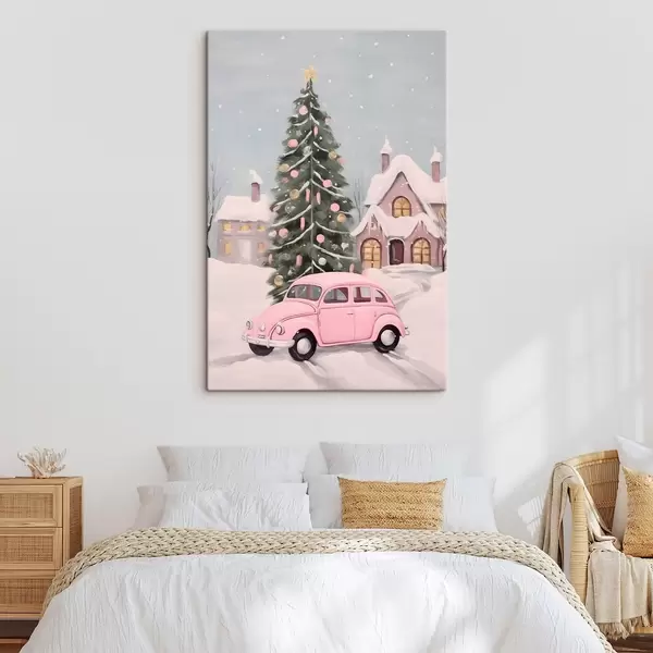 Schilderij Roze auto en versierde kerstboom buiten het huis Art. s46621