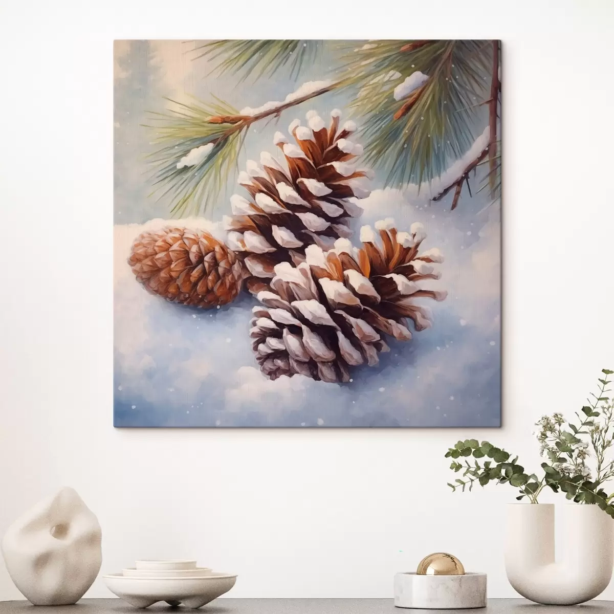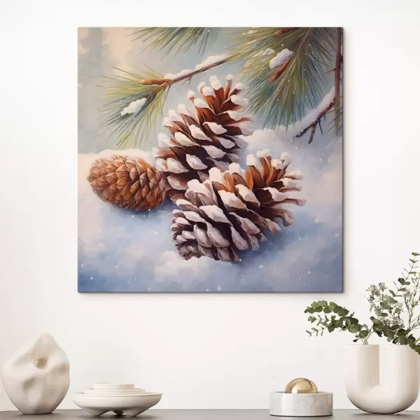 Schilderij Met sneeuw bedekte dennenappels en takken Art. s46631