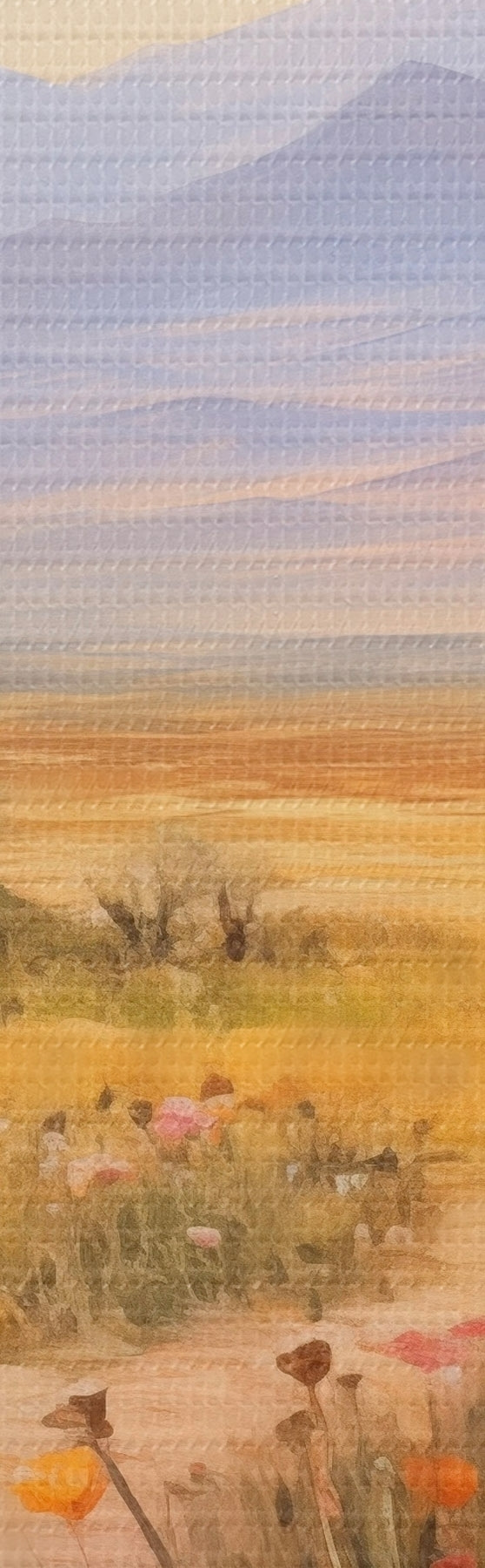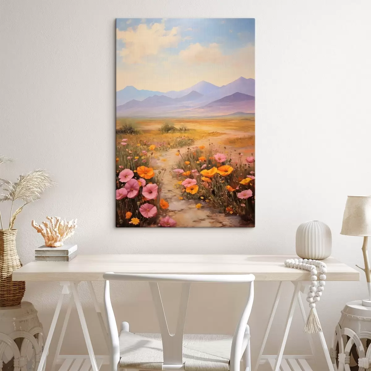 Schilderij Landschap, een veld met kleurrijke bloemen en bergen op de achtergrond, zachte pastelkleuren Art. s46686