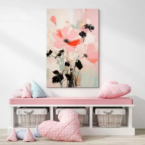 Schilderij Roze en zwarte bloemen met bladeren, zachte pastelkleuren, abstract bloemstuk, minimalistische kunst Art. s46687
