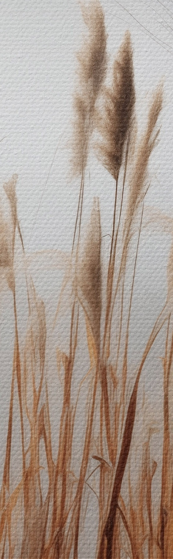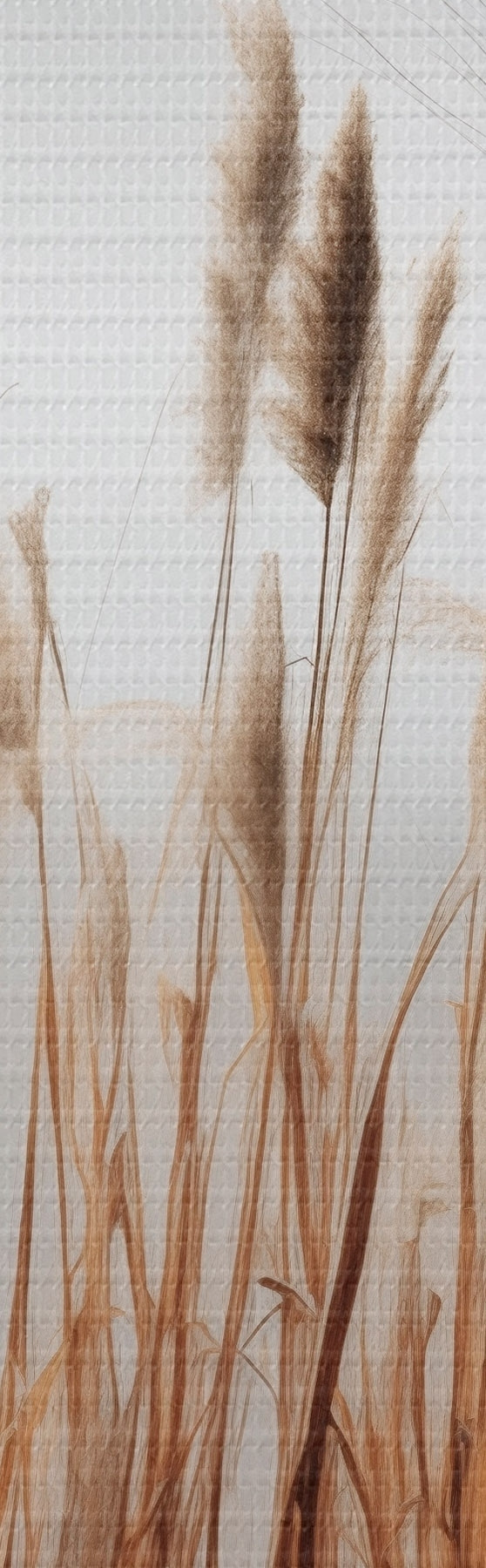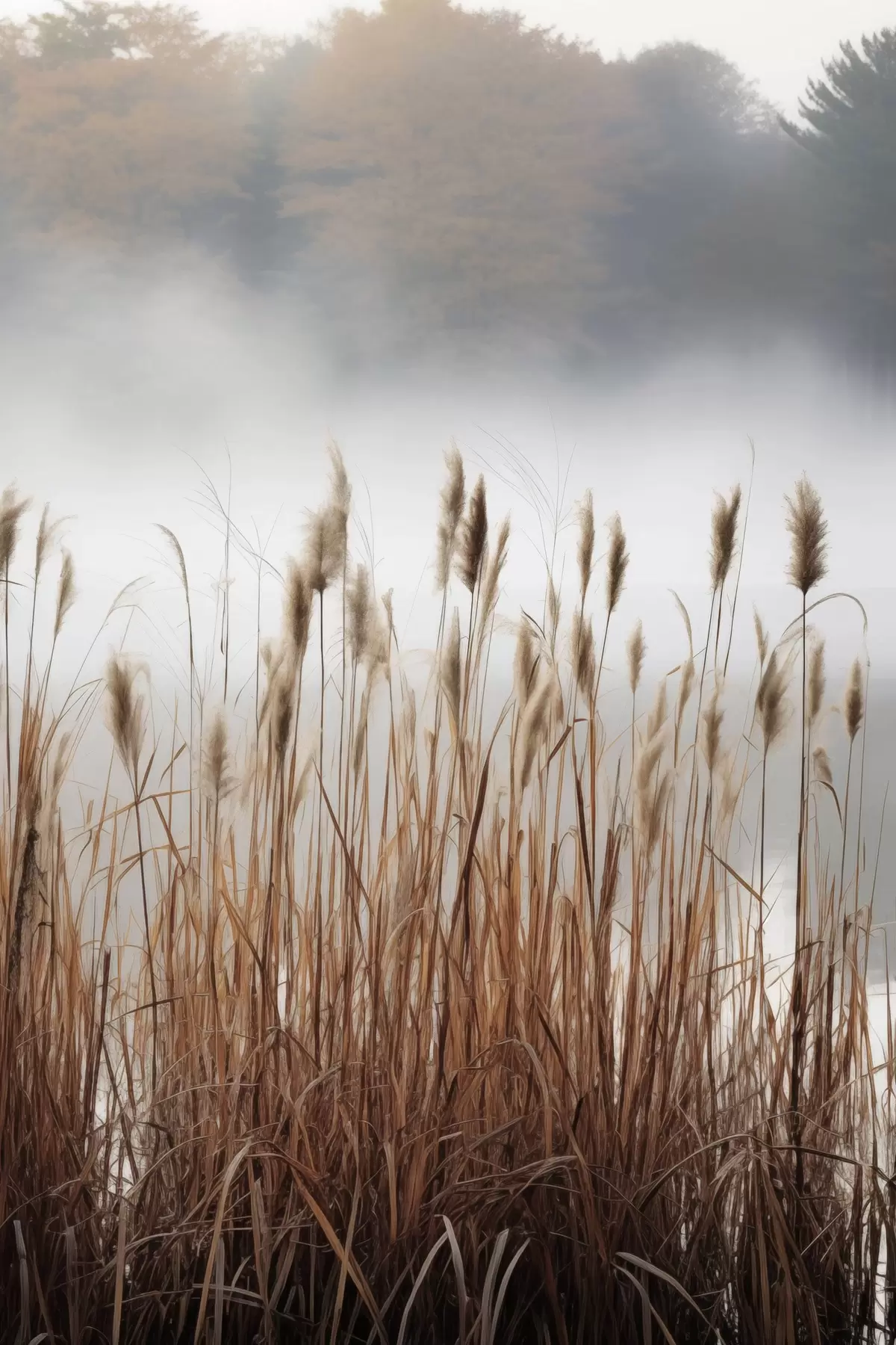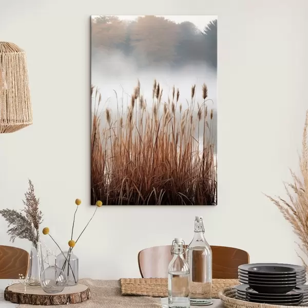 Schilderij Hoge rietstengels groeien in een watermassa, het water weerspiegelt het riet, mistige achtergrond, zacht licht, natuurtafereel Art. s46696