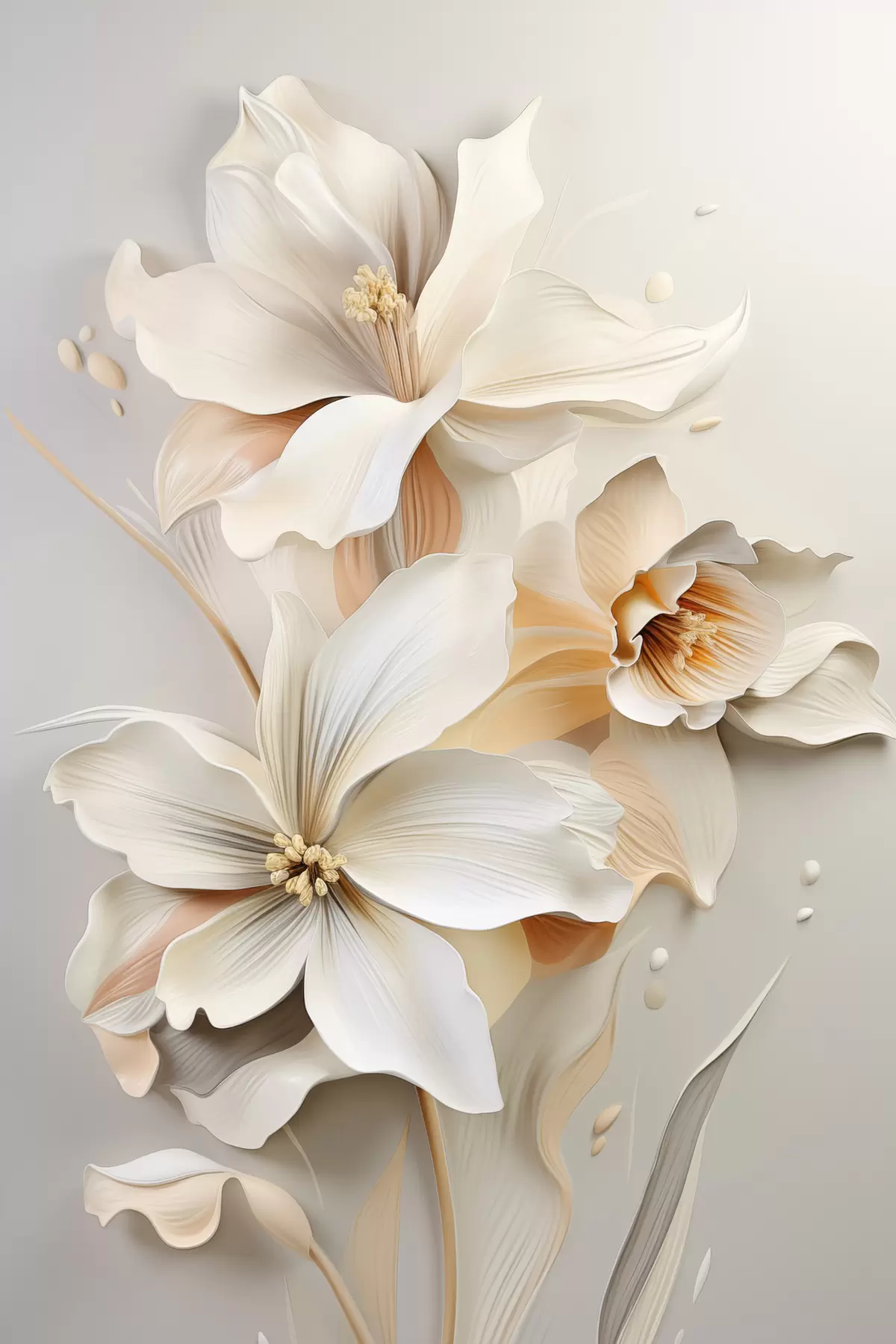Schilderijen Witte bloemen, bloemblaadjes met zachte schaduwen, lichtbeige achtergrond, elegante compositie, minimalistische stijl s46699