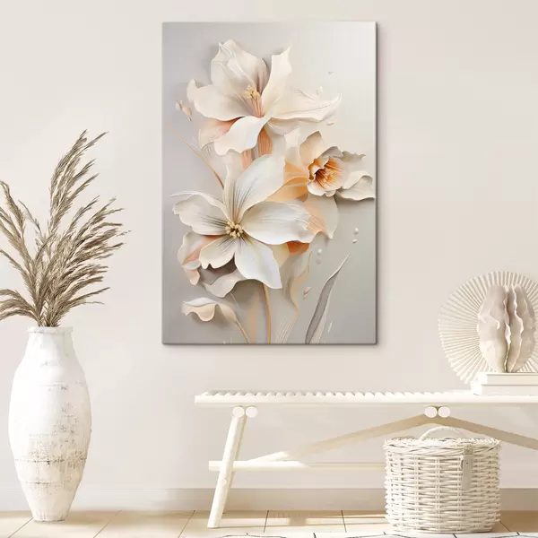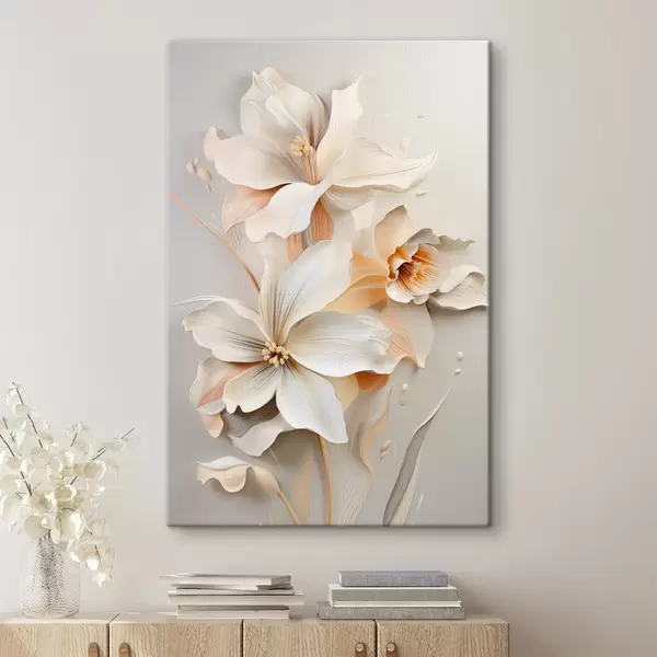 Schilderij Witte bloemen, bloemblaadjes met zachte schaduwen, lichtbeige achtergrond, elegante compositie, minimalistische stijl Art. s46699