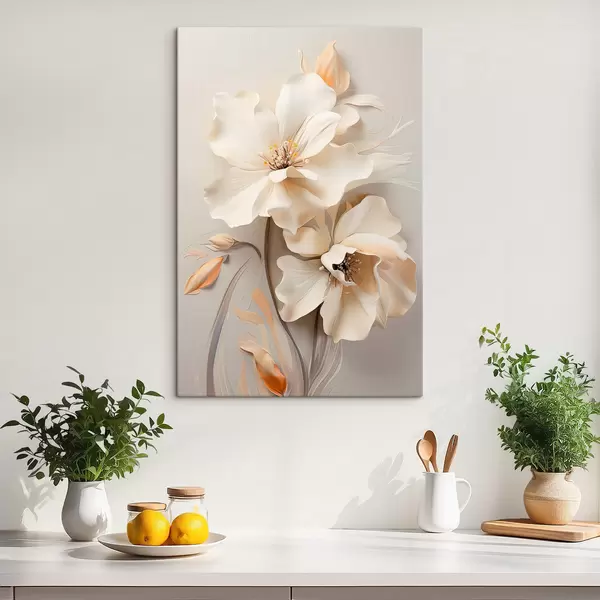 Schilderij Witte bloemen, bloemblaadjes met zachte schaduwen, lichtbeige achtergrond, elegante compositie, minimalistische stijl Art. s46700