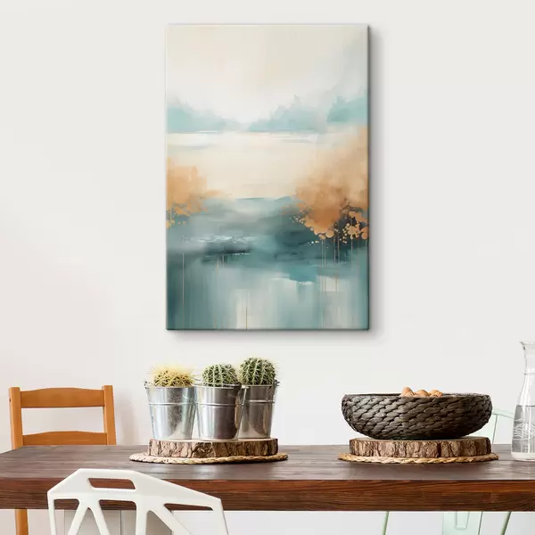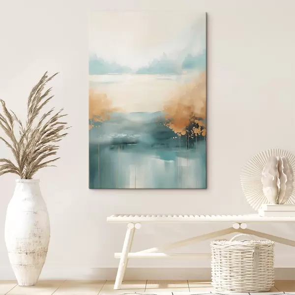 Schilderijen Abstract landschap met bergen en meer in blauwgroen en gestructureerd geel, zachte penseelstreken, minimalistisch kunstwerk s46704