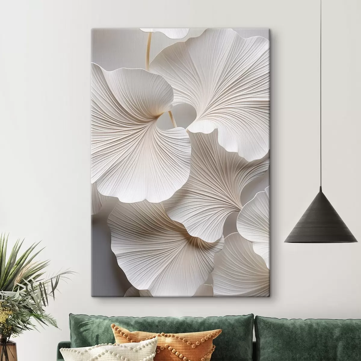 Schilderij Witte ginkgo biloba-bladeren met gedetailleerde nerven, zachte verlichting, elegant en minimalistisch ontwerp met textuur Art. s46705