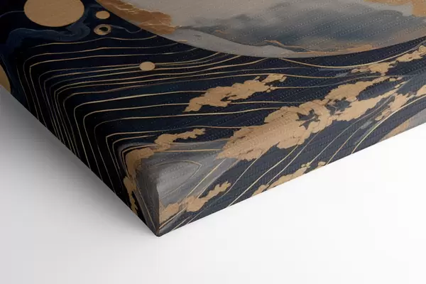 Schilderij Getextureerde decoratieve planeet met gele lijnen op de achtergrond, gele stippen op de achtergrond, donkere achtergrond Art. s46708