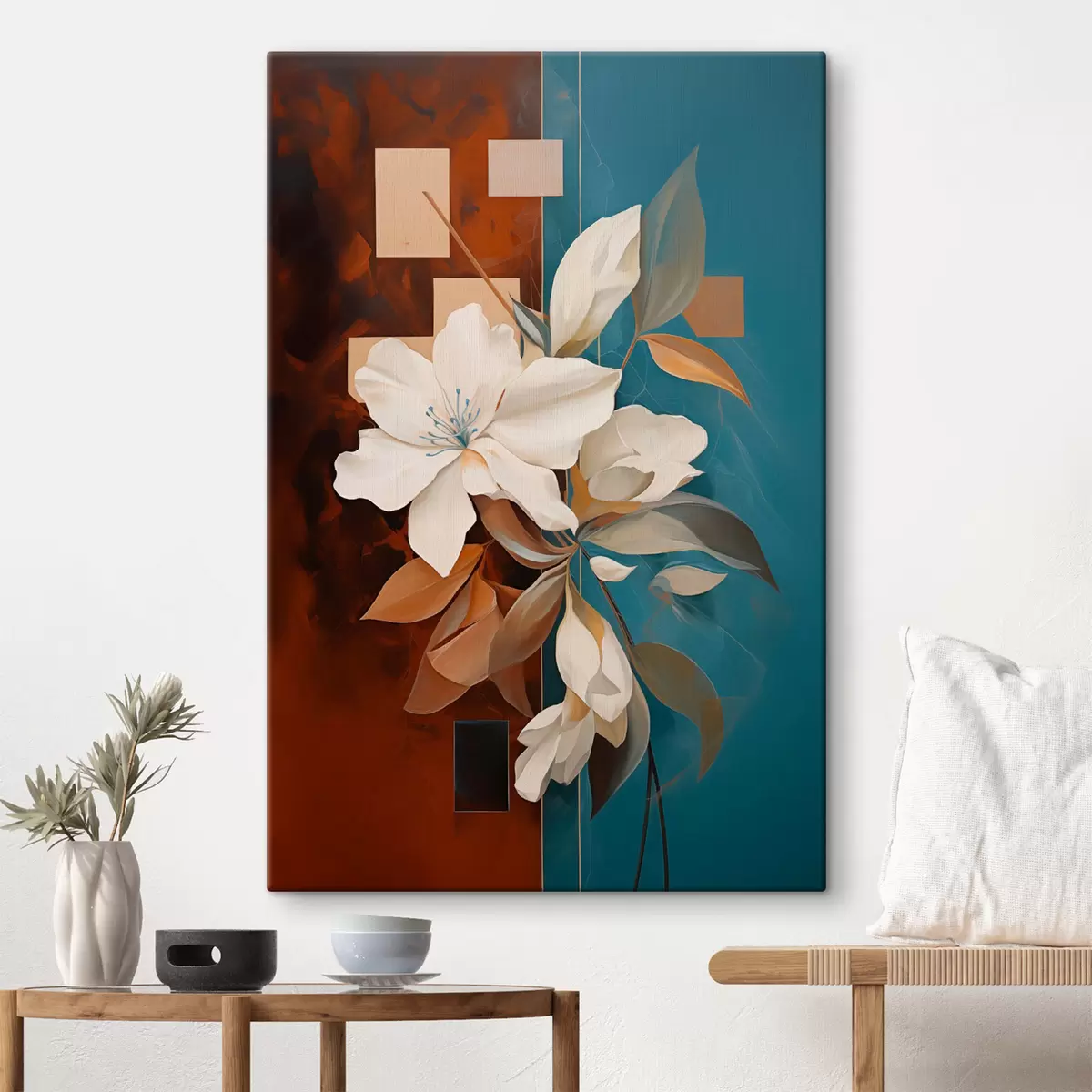 Schilderijen Abstracte witte bloemen en bladeren tegen een achtergrond van bruin en blauw met abstracte vormen, in een minimalistische stijl s46709