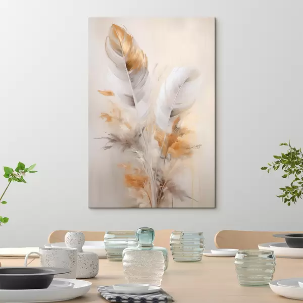 Schilderij Abstracte veren, omgeven door beige en bruine pluimen, zacht en delicaat, op een lichtbeige achtergrond Art. s46711
