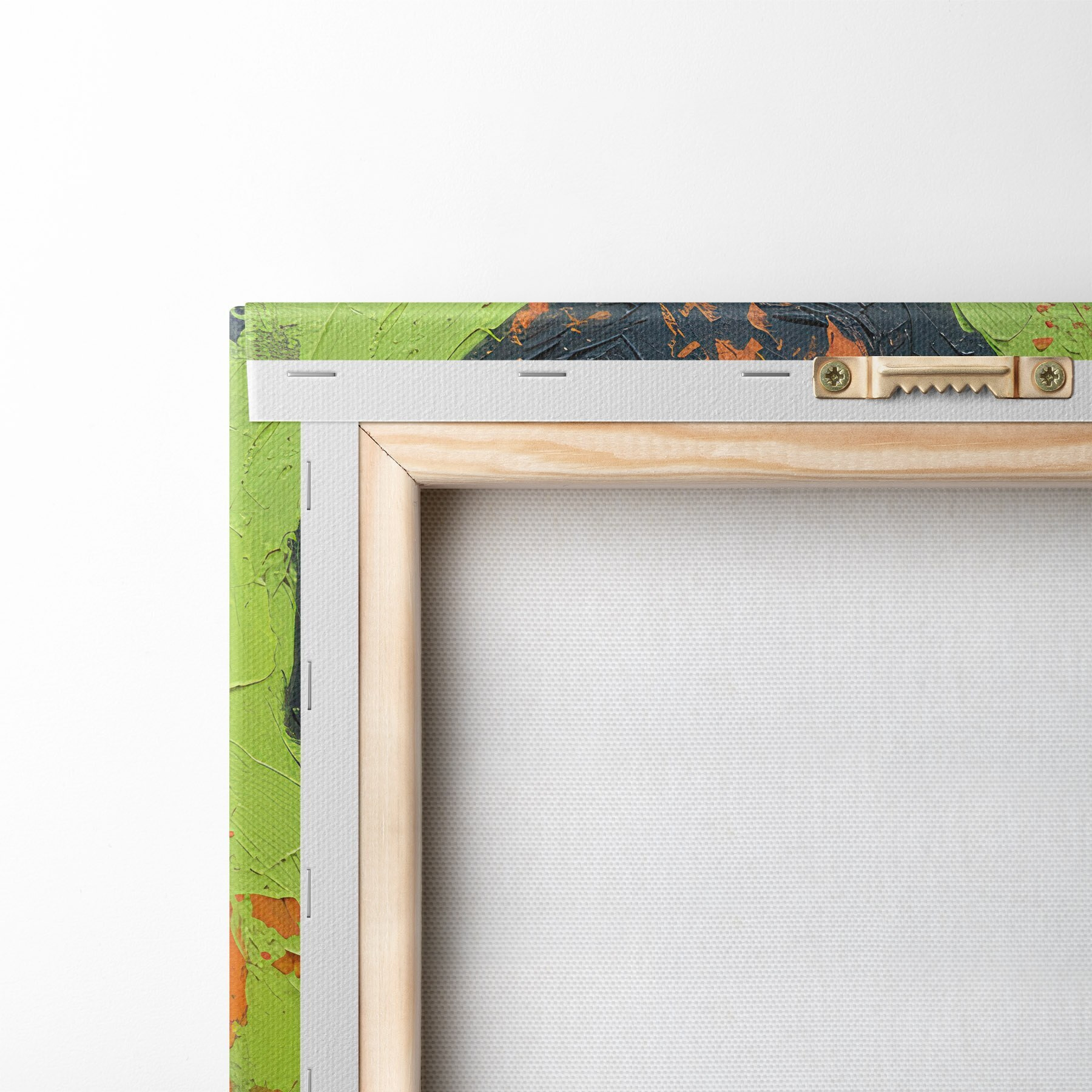 Het schilderij kan direct na ontvangst worden opgehangen. Het schilderij wordt opgespannen op een 2 cm breed houten spieraam.