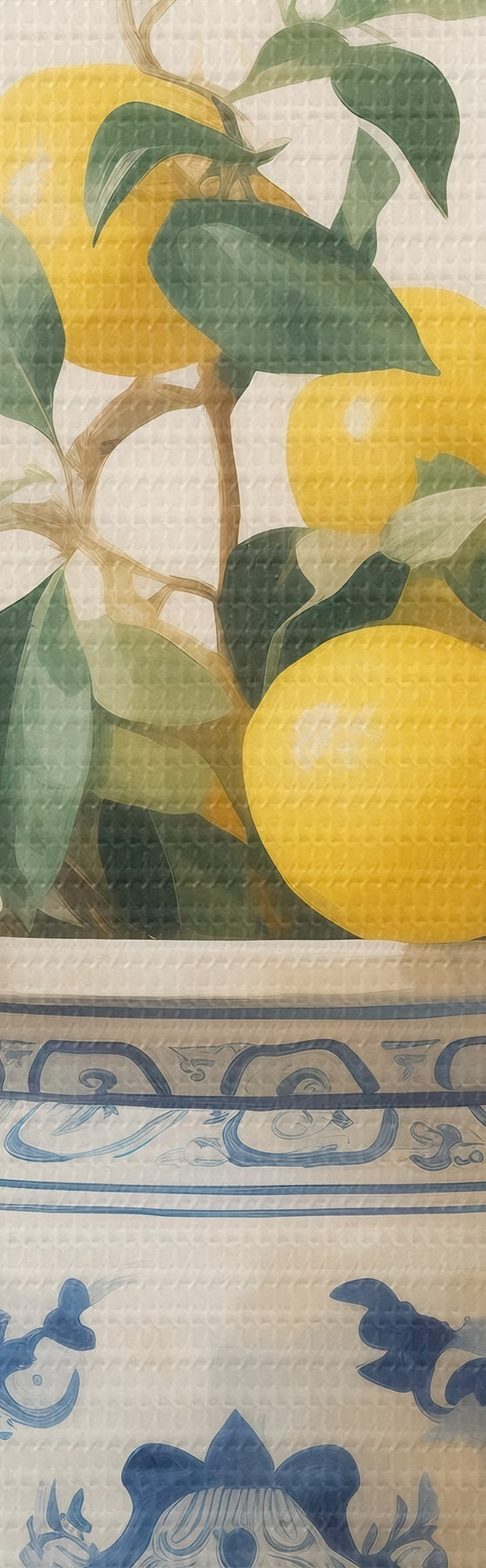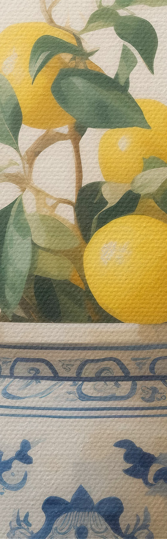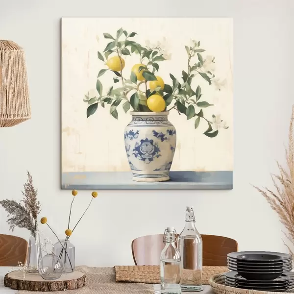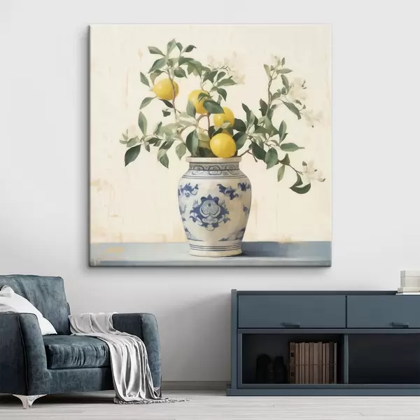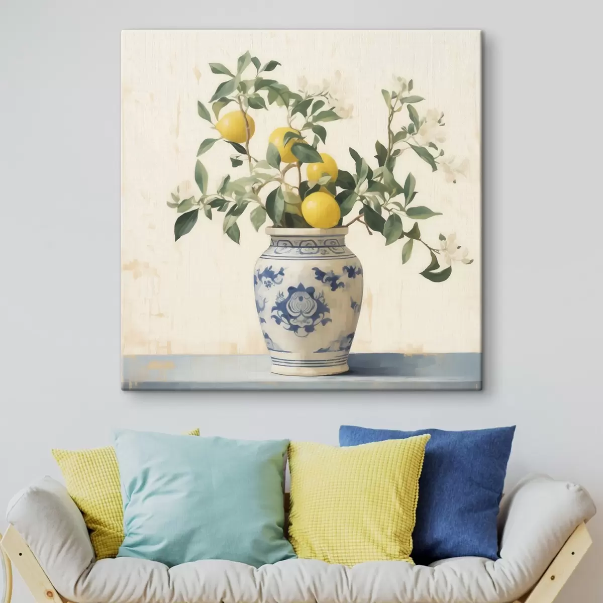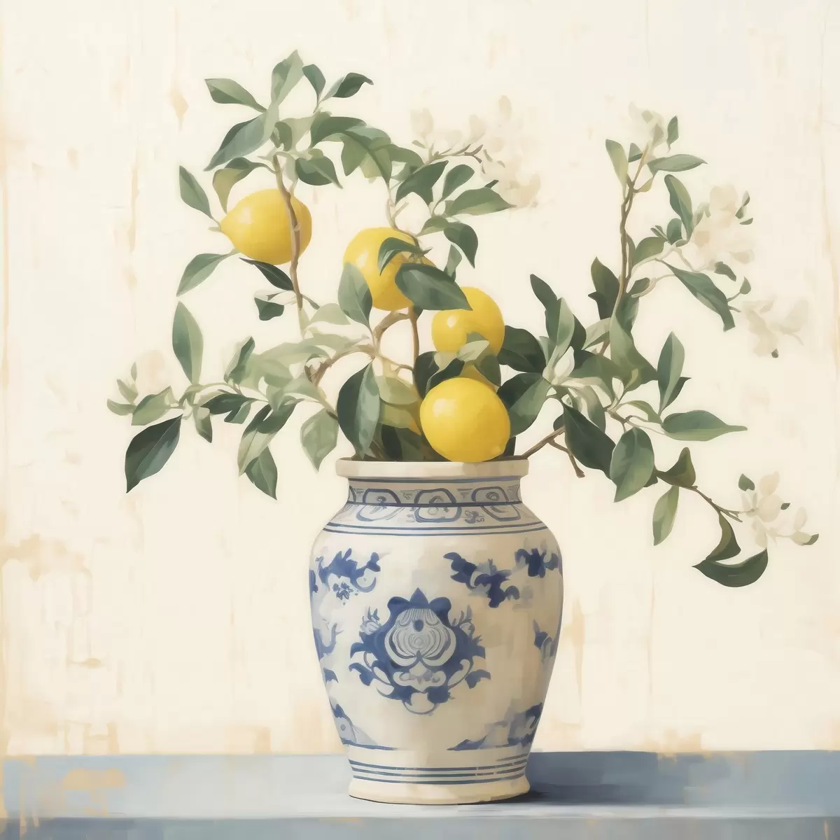 Schilderij Citroenen in een blauw-witte keramische vaas in de stijl van een olieverfschilderij Art. s46924