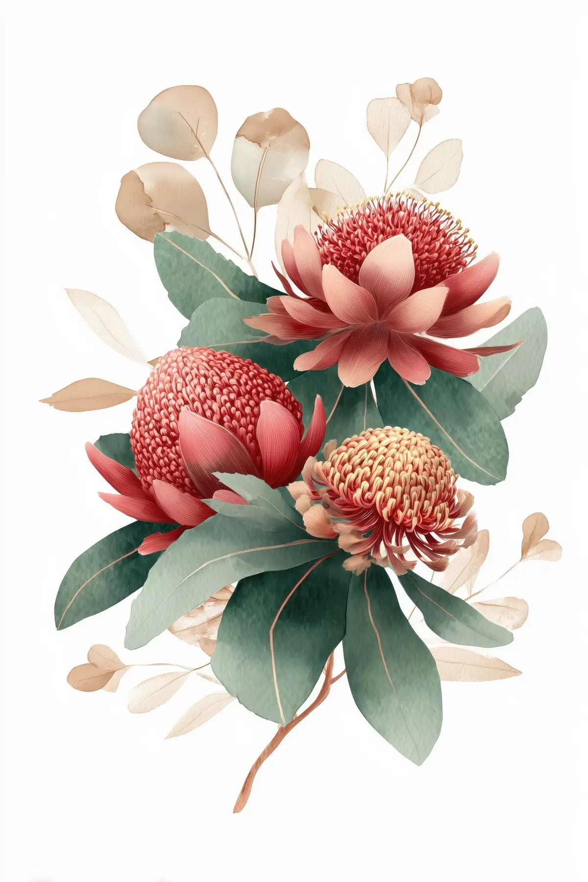 Schilderij Bloemstuk met grote protea's en eucalyptus in moderne digitale schilderstijl Art. s46955