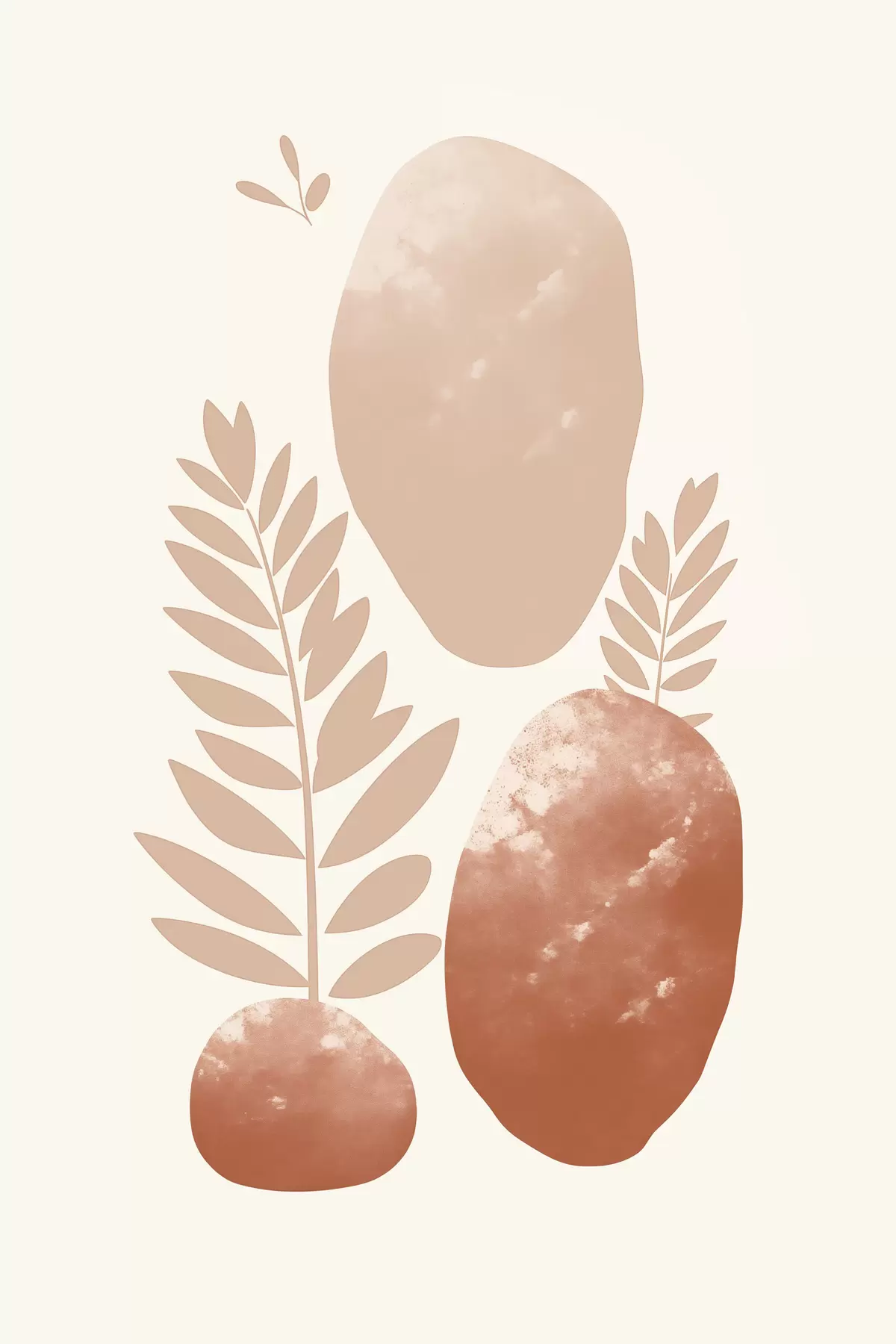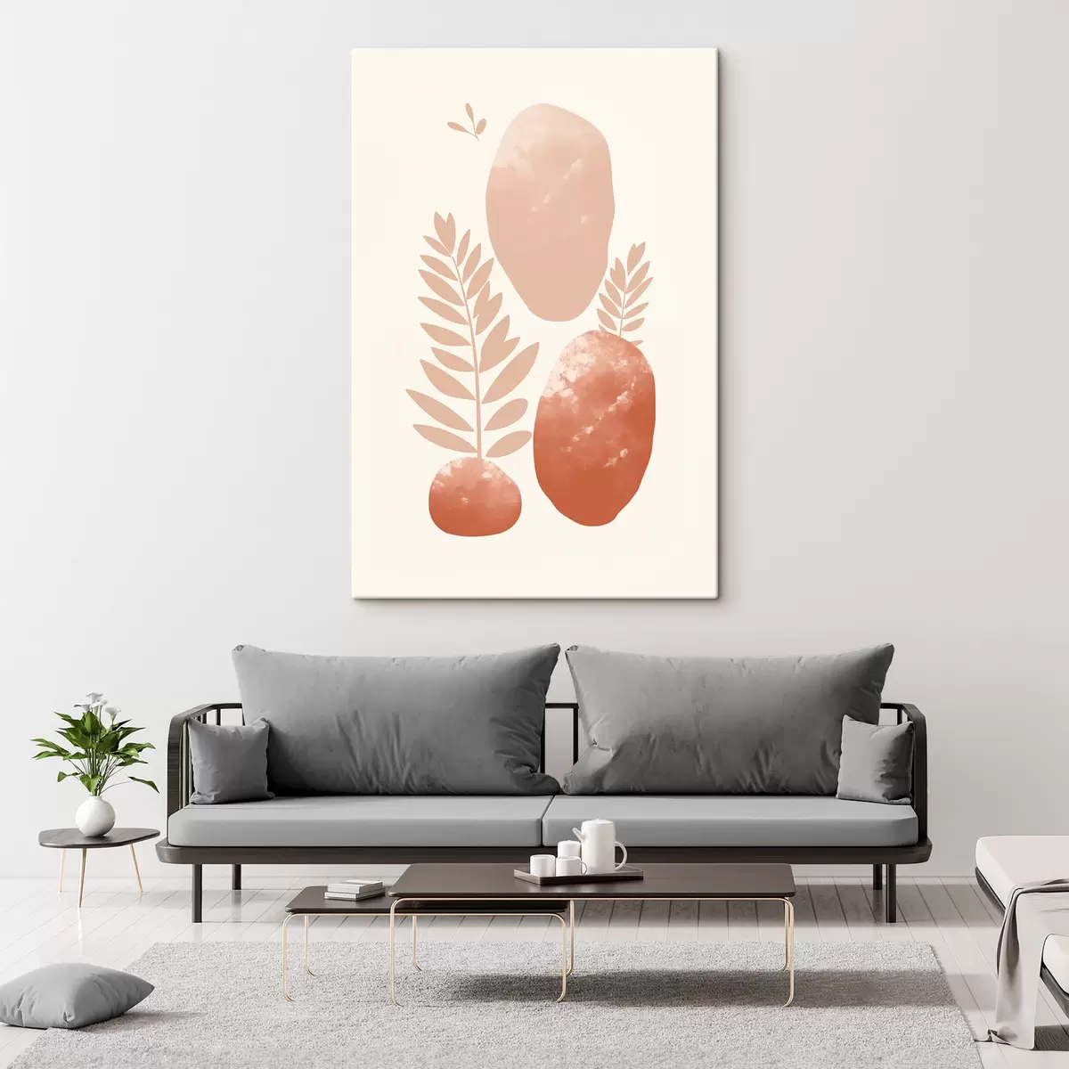 Schilderij Abstracte vormen, gestructureerde stenen en bladeren in gedempte perzik- en terracottatinten, minimalistisch, crèmekleurige achtergrond Art. s47012