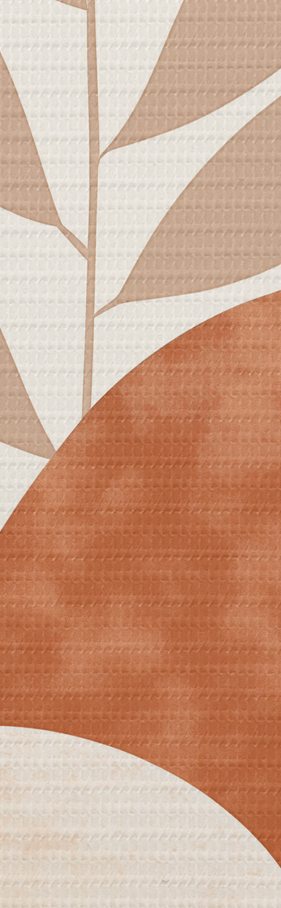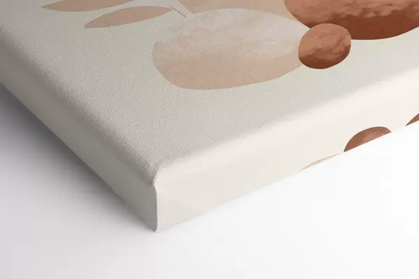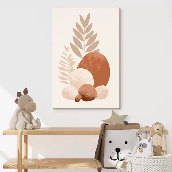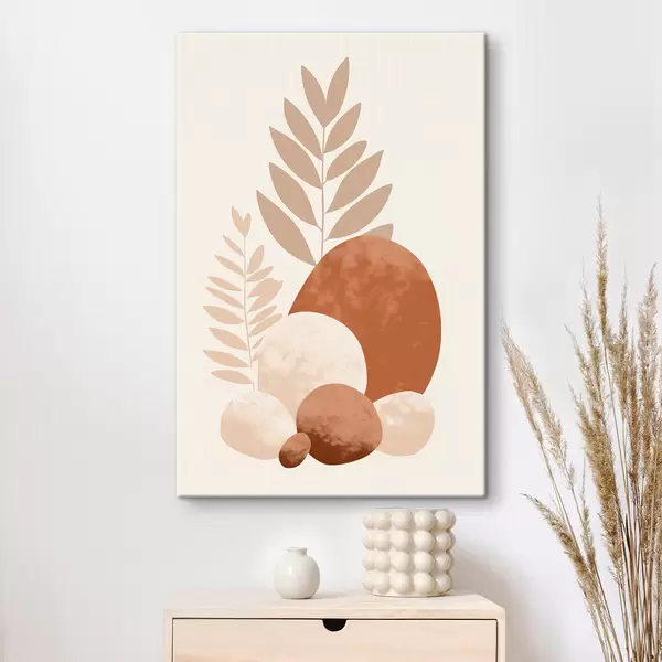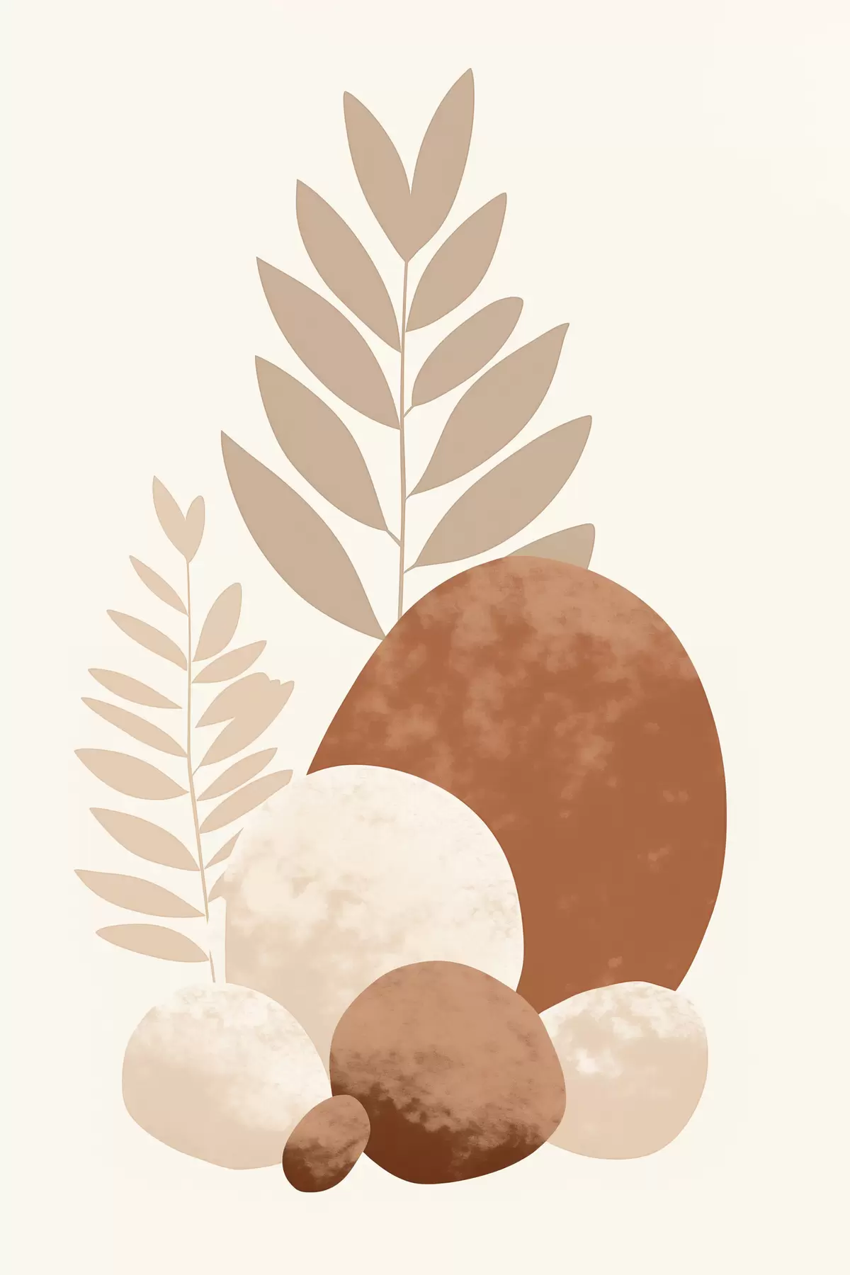 Schilderij Abstracte vormen, gestructureerde stenen en bladeren in gedempte perzik- en terracottatinten, minimalistisch, crèmekleurige achtergrond Art. s47013