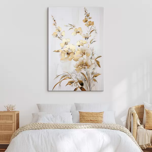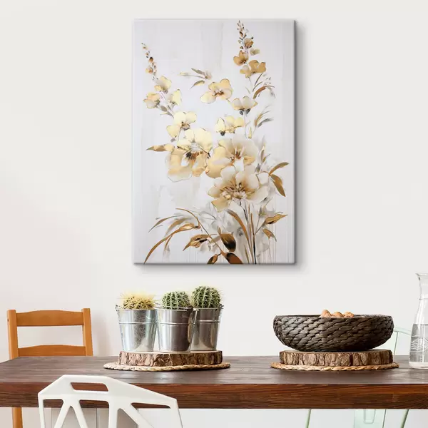 Schilderij Getextureerde gele bloemen en bladeren tegen een witte achtergrond, met delicate penseelstreken Art. s47016