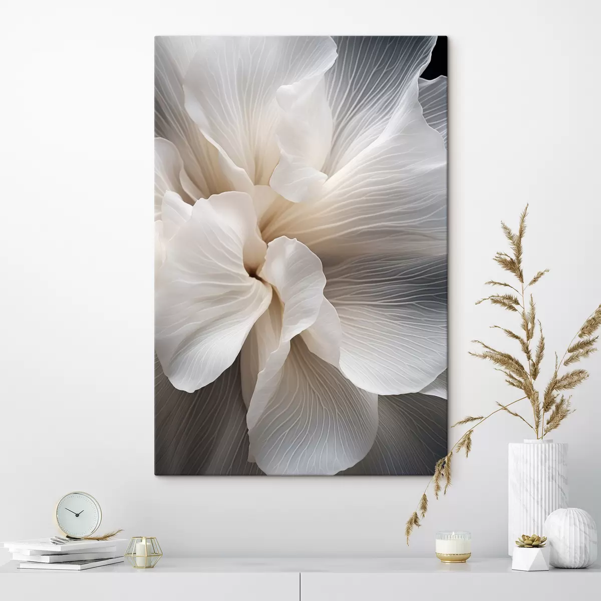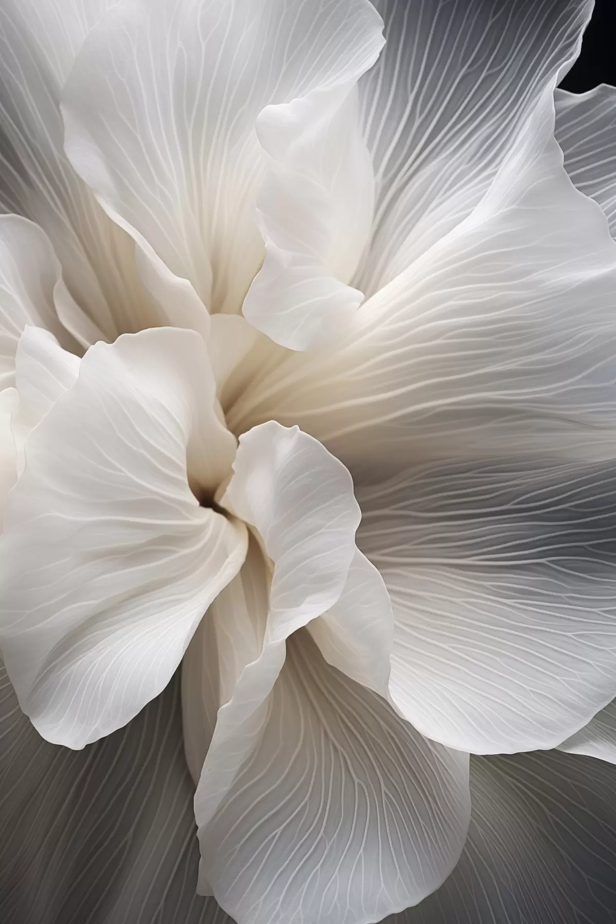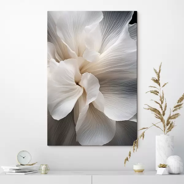 Schilderij Close-up van delicate abstracte witte bloemblaadjes met ingewikkelde lijnen en een wazige donkere achtergrond Art. s47018