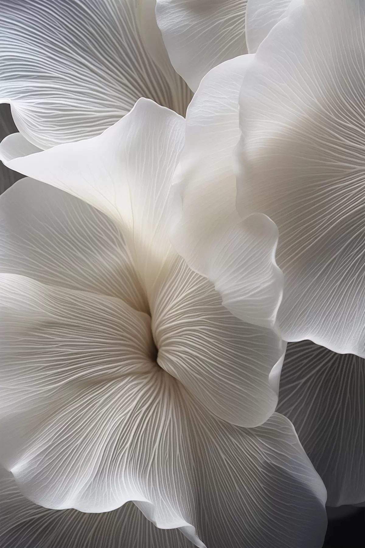 Schilderijen Close-up van delicate abstracte witte bloemblaadjes met ingewikkelde lijnen en een wazige donkere achtergrond s47019
