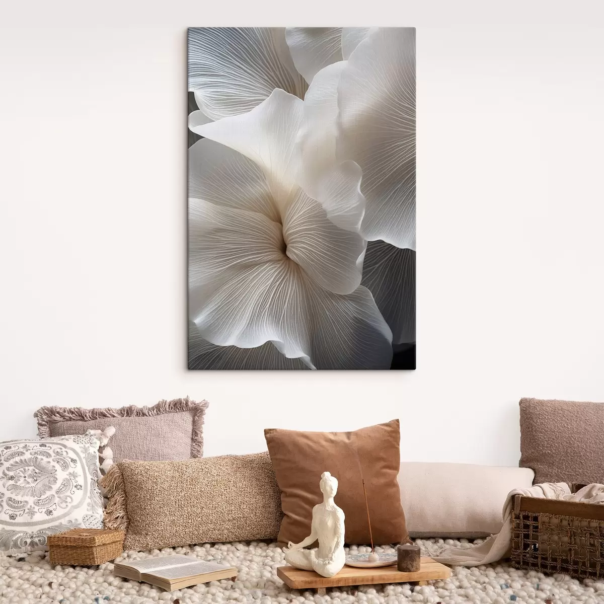 Schilderij Close-up van delicate abstracte witte bloemblaadjes met ingewikkelde lijnen en een wazige donkere achtergrond Art. s47019