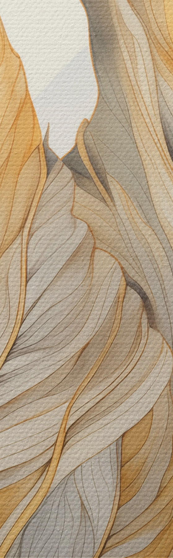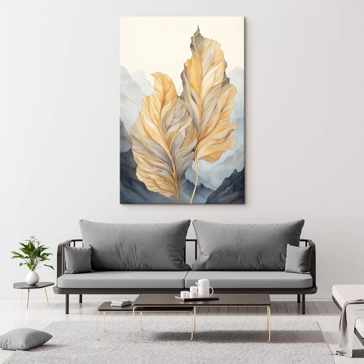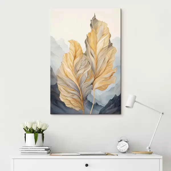 Schilderij Abstracte grote, gele en bruine bladeren met ingewikkelde details, tegen een berglandschap Art. s47023