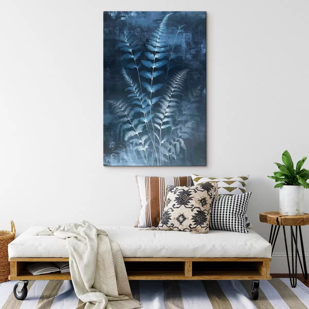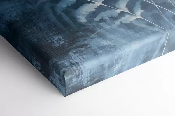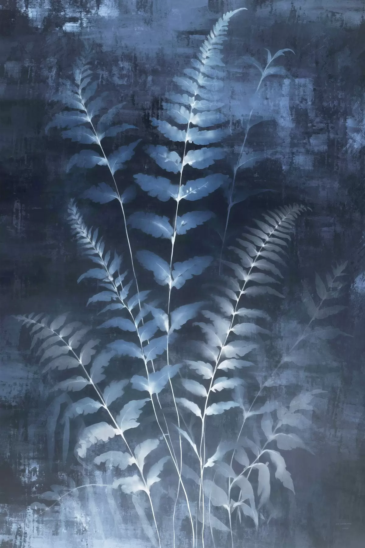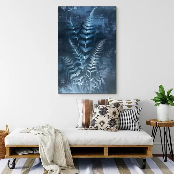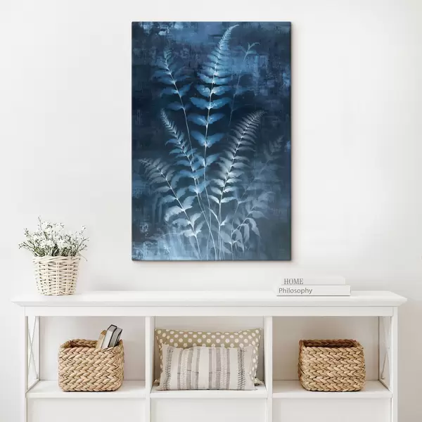 Schilderij Blauwe varens en planten tegen een donkere, gestructureerde achtergrond, met de nadruk op de ingewikkelde details, röntgeneffect Art. s47027