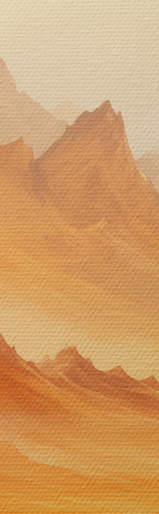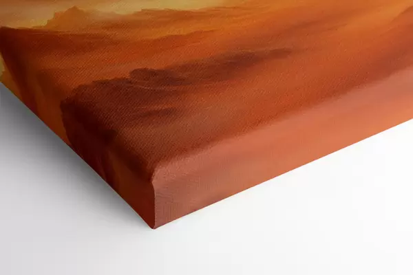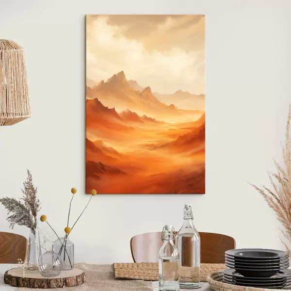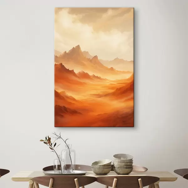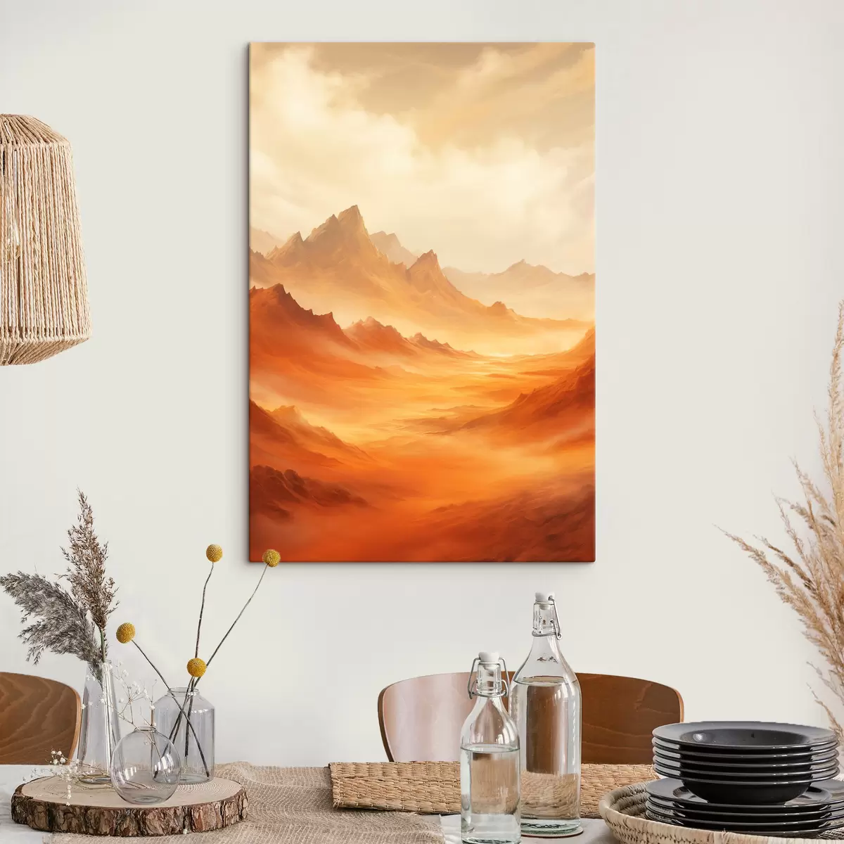 Schilderij Een uitgestrekt, oranje woestijnlandschap met torenhoge, rotsachtige bergen onder een wazige, zonovergoten hemel met dunne wolken. Art. s47029