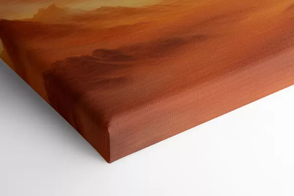 Schilderij Een uitgestrekt, oranje woestijnlandschap met torenhoge, rotsachtige bergen onder een wazige, zonovergoten hemel met dunne wolken Art. s47029