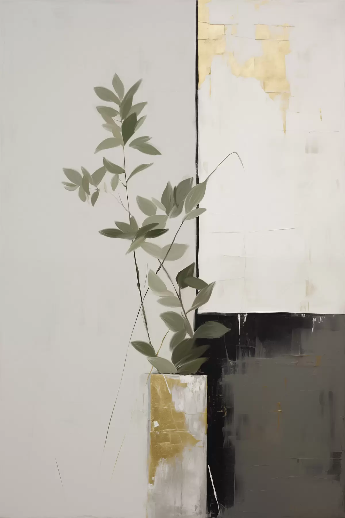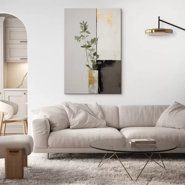 Schilderij Een minimalistisch schilderij met textuur van een vaas met groene bladeren tegen een achtergrond van abstracte geometrische vormen Art. s47036