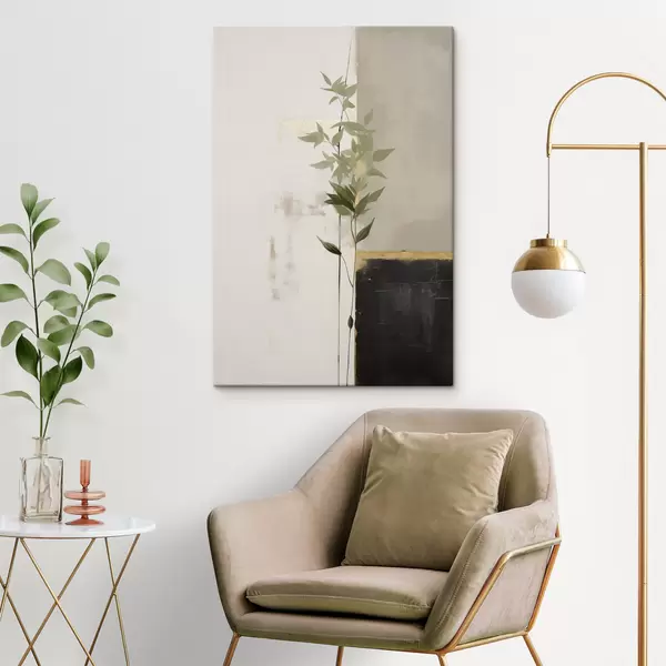 Schilderijen Een minimalistisch schilderij met textuur van een vaas met groene bladeren tegen een achtergrond van abstracte geometrische vormen. s47037