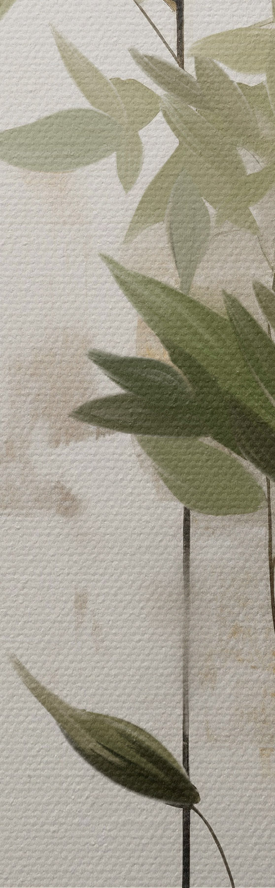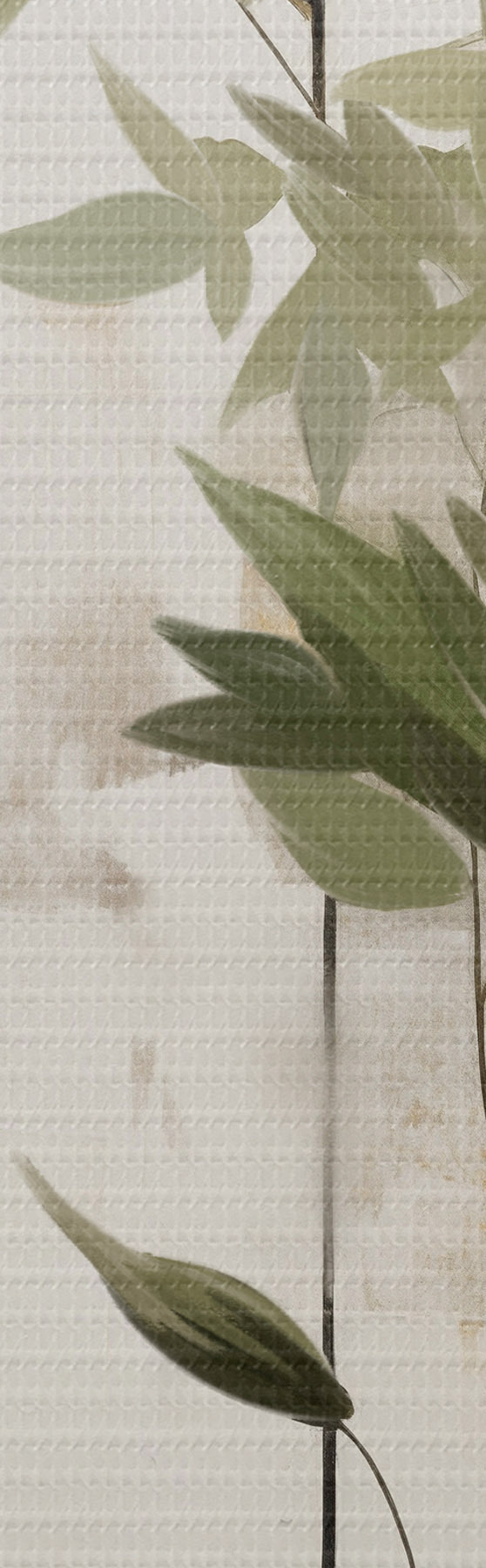 Schilderij Een minimalistisch schilderij met textuur van een vaas met groene bladeren tegen een achtergrond van abstracte geometrische vormen. Art. s47037