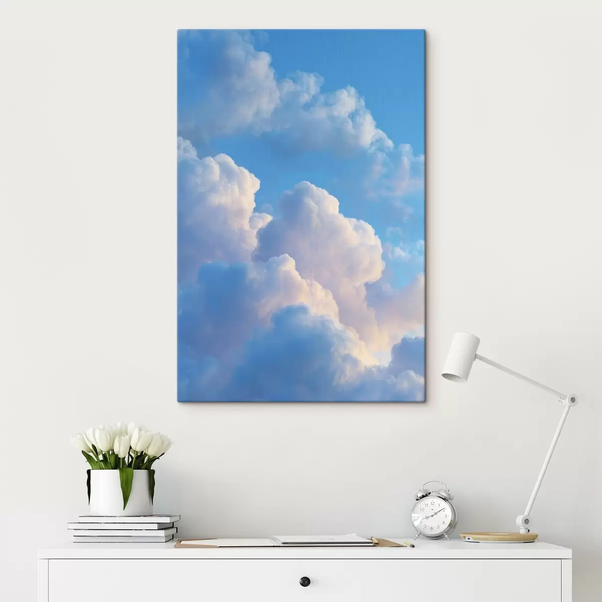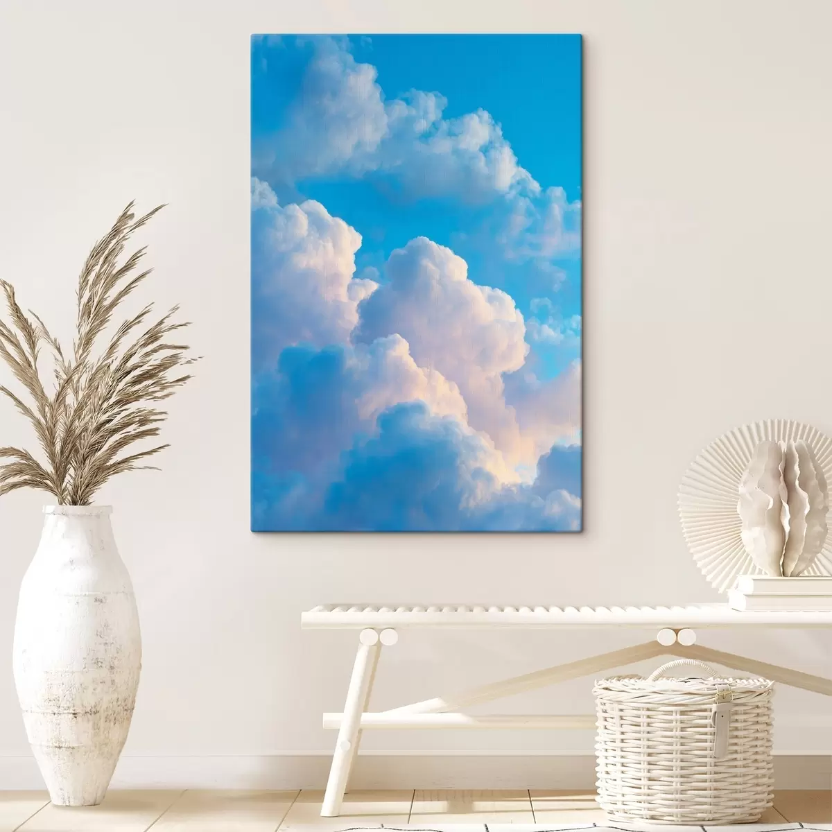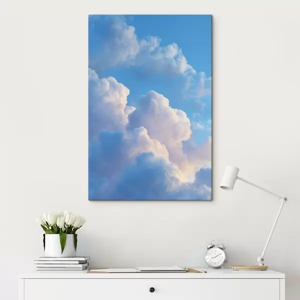 Schilderij Volumineuze wolken in een zacht blauw en roze kleurenpalet in fotorealistische digitale grafische stijl Art. s47088
